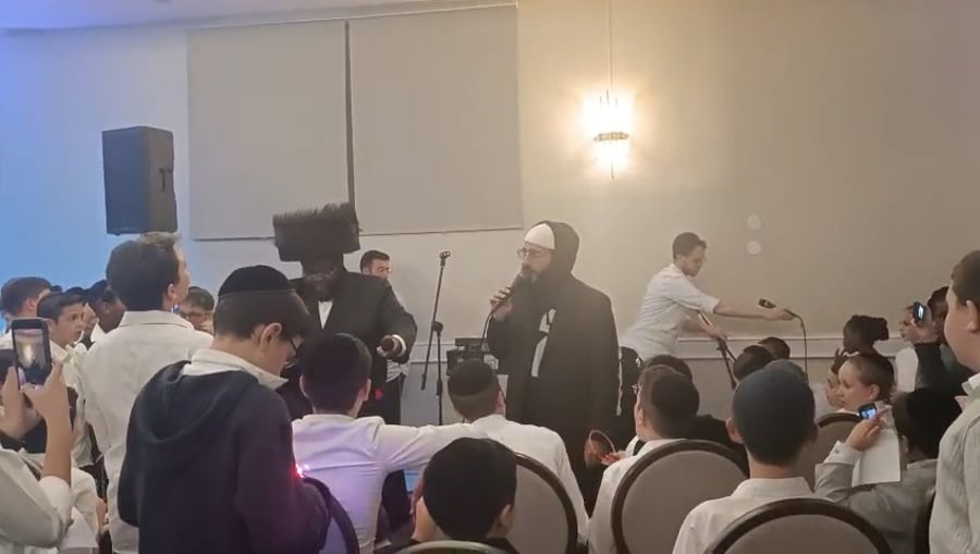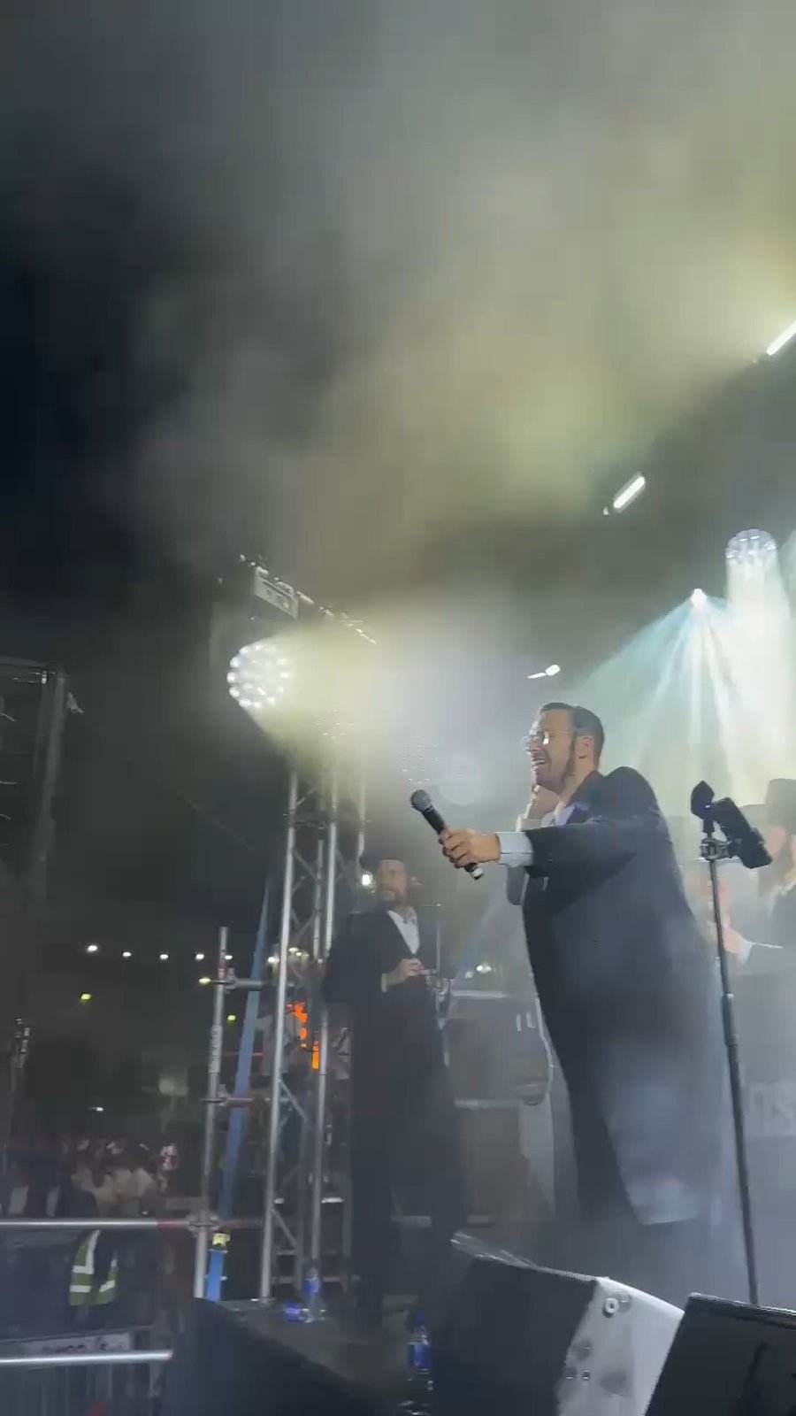 הזמרים אהרל'ה סמט ומוטי ויזל וחברי מקהלת 'נשמה', מקפיצים בשירי ל"ג בעומר בהדלקה המרכזית של ישיבת 'אורייתא' במירון.