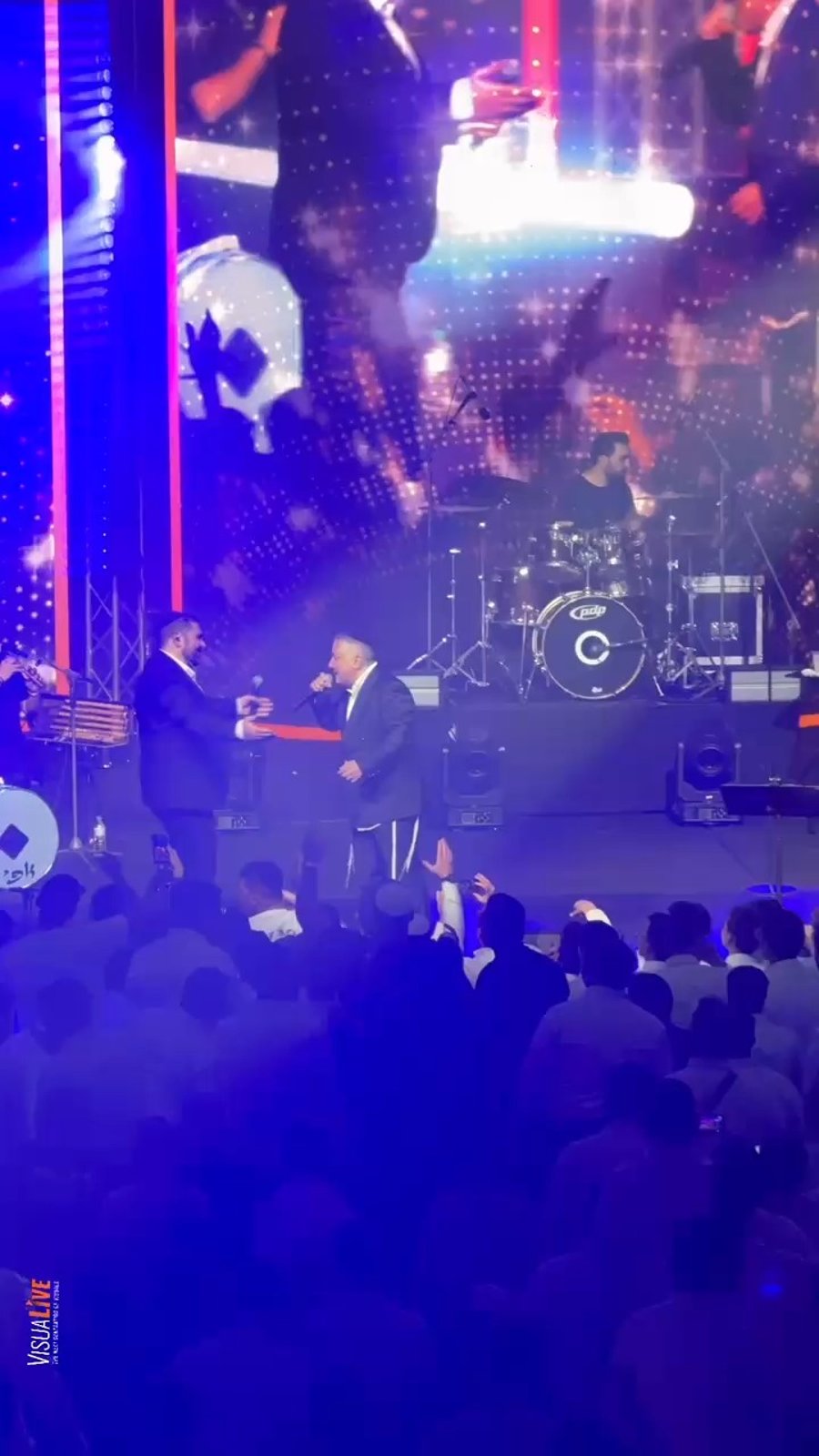 הזמרים יניב בן משיח ודוד חפצדי מקפיצים בשירה מזרחית במופע חג שבועות של 'תפארת' ב'בנייני האומה' בירושלים.