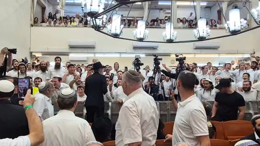 לא רק מזכה רבים: הגאון הרב יגאל כהן ראש מוסדות 'יביע אומר' וחבר מועצת הרבנות הראשית לישראל, בשירה ופיוט בהכנסת ספר תורה בקיסריה. יניב בן משיח נראה מבסוט.