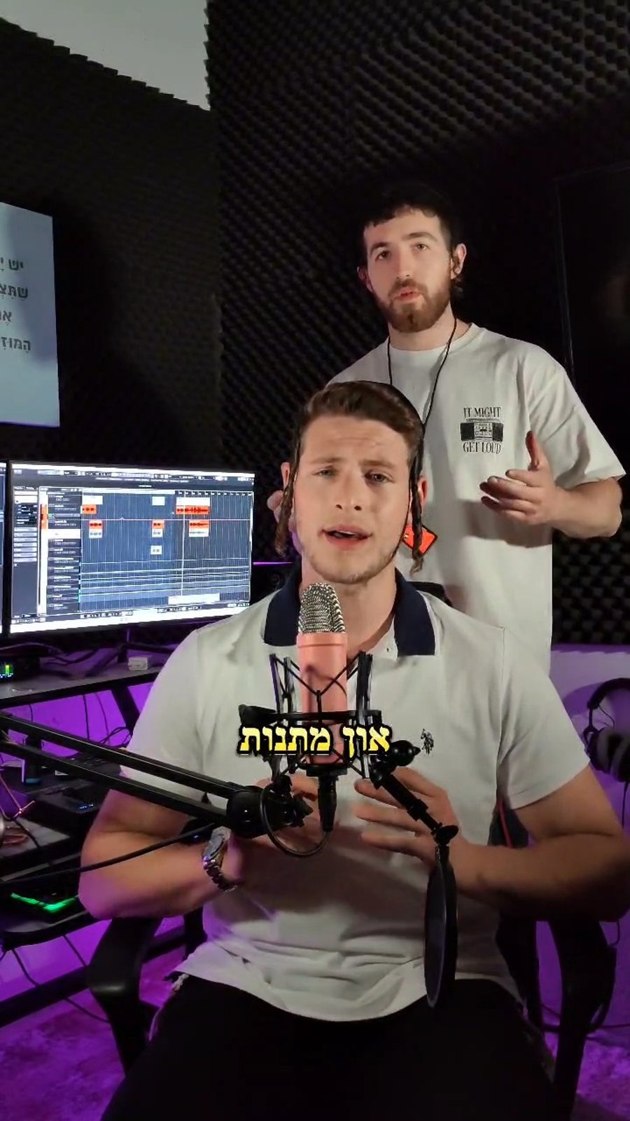 הזמרים אופיר סלומון ואלחנן משמרתי בצילומים למחרוזת בקשות בבית הכנסת 'עדס' בירושלים.