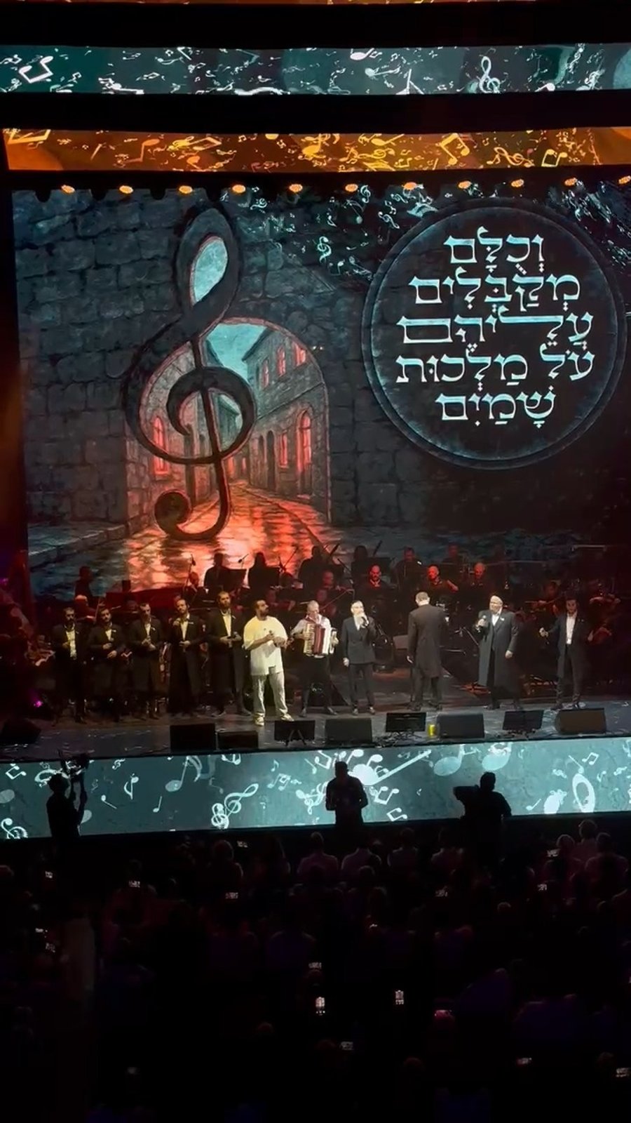 המוזיקאים אברהם פריד, יצחק מאיר הלפגוט, שלום למר ו'עקיבא', בשירה מרגשת "וכולם מקבלים עליהם עול מלכות שמיים" בניצוחו של יובל סטופל, בקונצרט 'חסידות בקלאס' - הצדעה לידידי מד"א באמפי קיסריה.