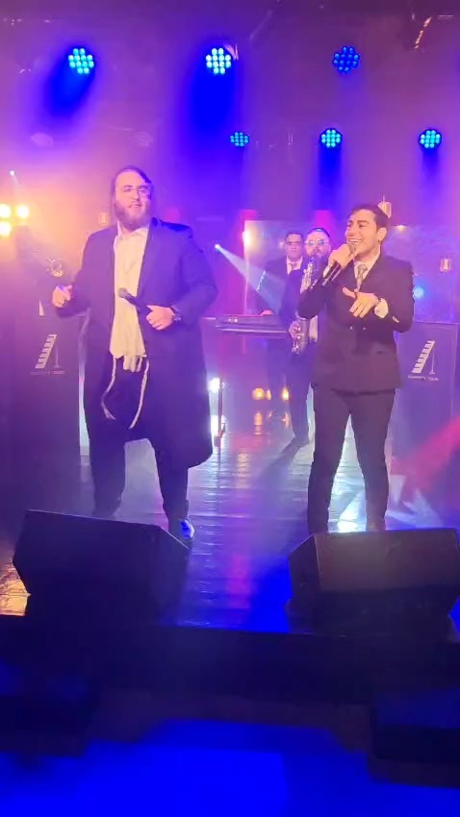 הזמרים ישי לפידות מישראל ואלי מרקוס מניו יורק מקפיצים בשירה, בשמחת החתונה לאחותו של המפיק יהודה גבאי בפריז שבצרפת.