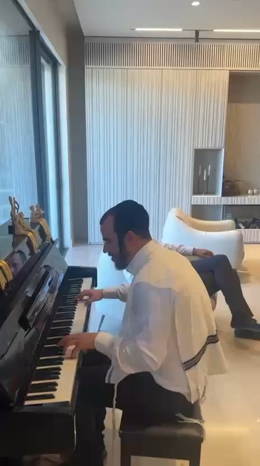 המלחין והיוצר בנצי שטיין בשירה משולבת בניגון על פסנתר ללהיט של ר' בן ציון שנקר "ממקומך", בביתו של ראש העיר בית שמש, שמוליק גרינברג.