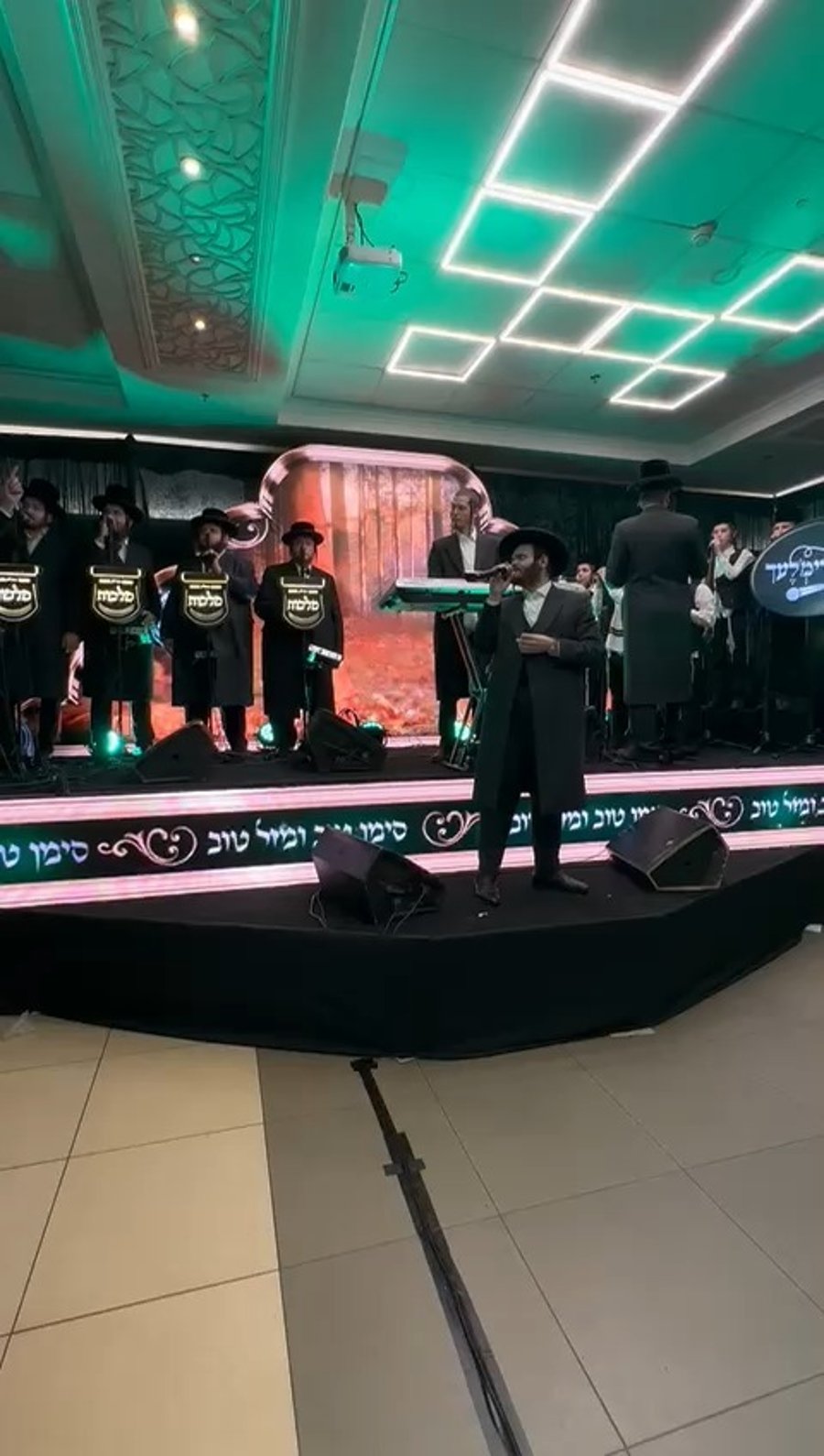 הזמר זאנוויל וינברגר, הקלידן צביקי לוין, וחברי מקהלות 'מלכות' ו'חסידמלעך', בשירה משותפת בשבע ברכות לאחיו של איש יחסי הציבור פנחס פלינקר.