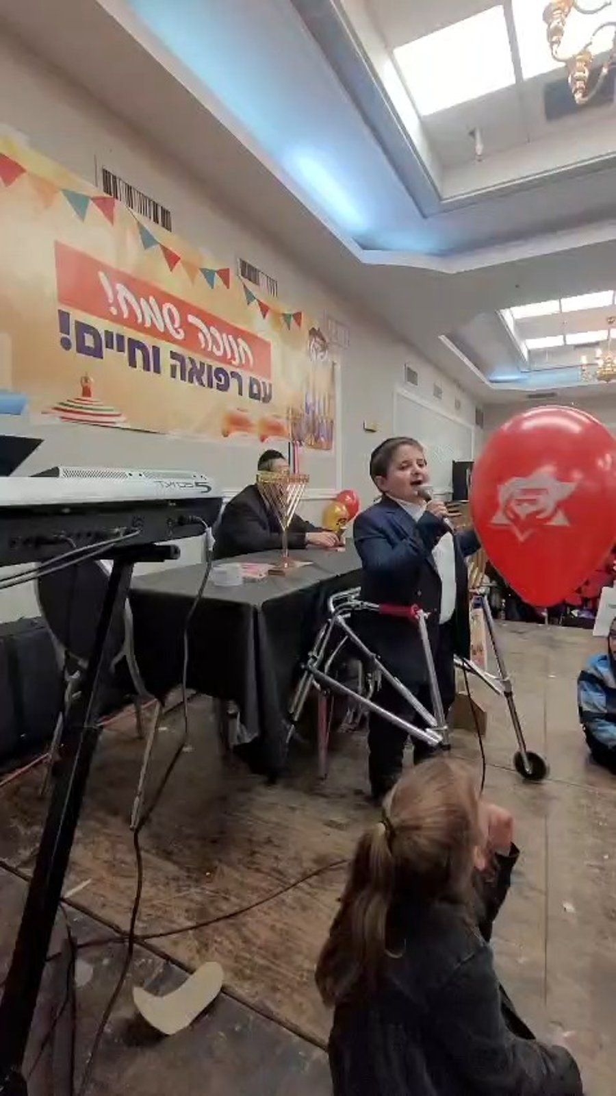 ישראל גולדרייך המכונה 'ילד הפלא על גלגלים', בשירה מרגשת: "שערי שמיים פתח, במסיבת חנוכה לילדים מיוחדים מארגון 'רפואה וחיים' של עסקני הרפואה הרב יצחק שטרן והרב ברוך הימל.