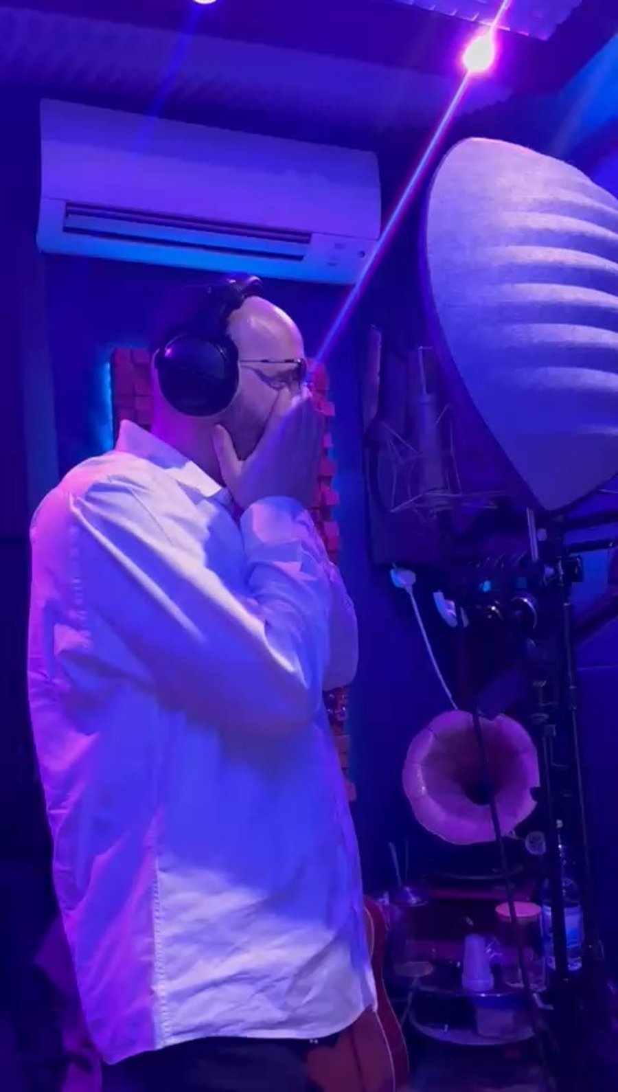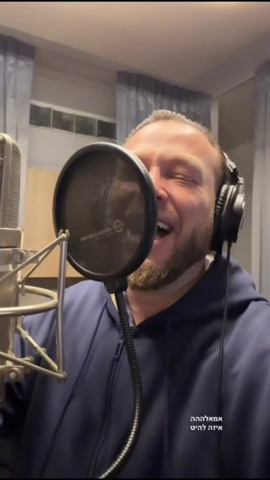 הזמר פיני איינהורן בהקלטות לשיר חדש, כשהו מזיל דמעות מהתרגשות.