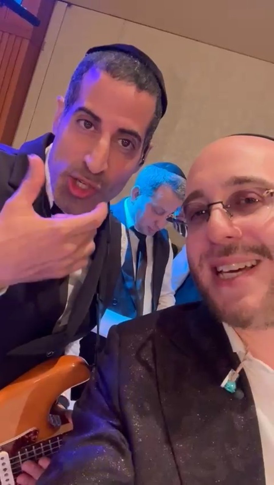 המוזיקאים יוסי ויטמן, שמוליק ולדר ומיכאל כהן, בשירה מרגשת בהכנסת ספר תורה שתרם חזקי כהן מבעלי מאפיית ויז'ניץ, חדי עין יבחינו ברב חיים מאיר הגר בנו של האדמו"ר מויז'ניץ.
