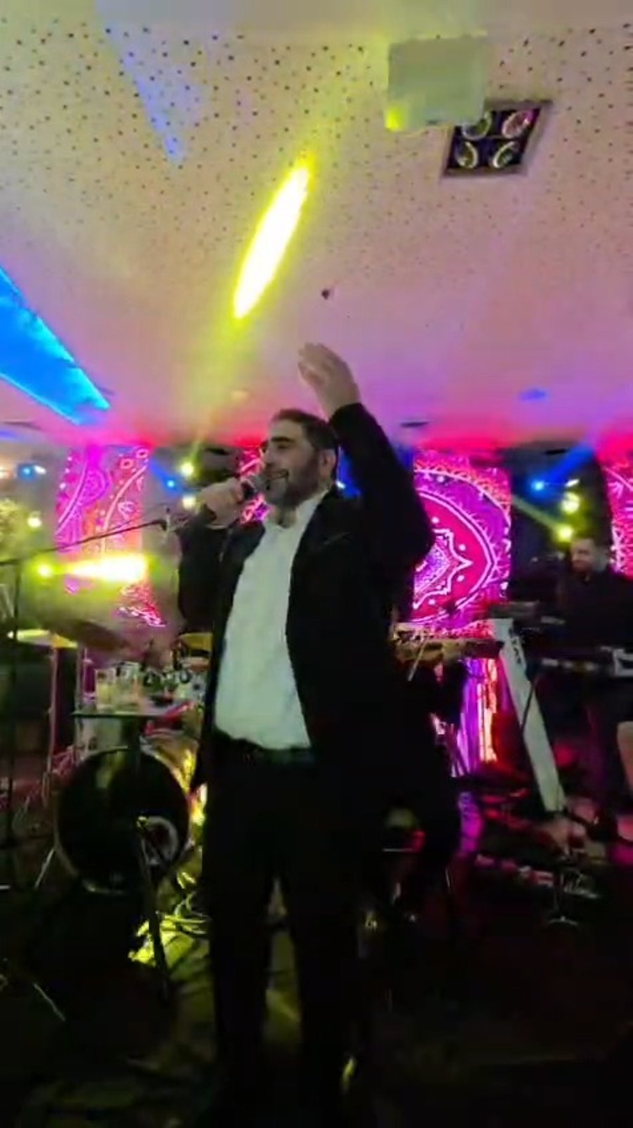 עם סכינים באוויר: המוזיקאים אבי מן ואשר גבאי מקפיצים בשירה בחתונה חרדית: "חמינאי עולה באש", באולמי 'אודל' בפתח תקווה.