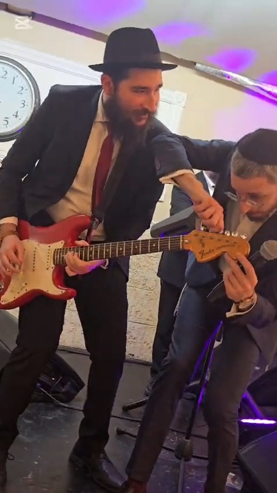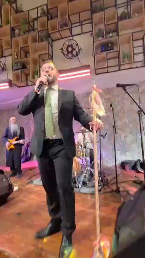 המוזיקאים נמואל הרוש ואהרל'ה נחשוני בביצוע לשיר: "עם ישראל לא מפחד", בחתונה שנערכה במקלט בעקבות הגבלות פיקוד העורף בשל המלחמה עם איראן.
