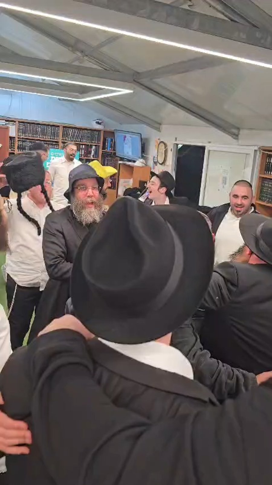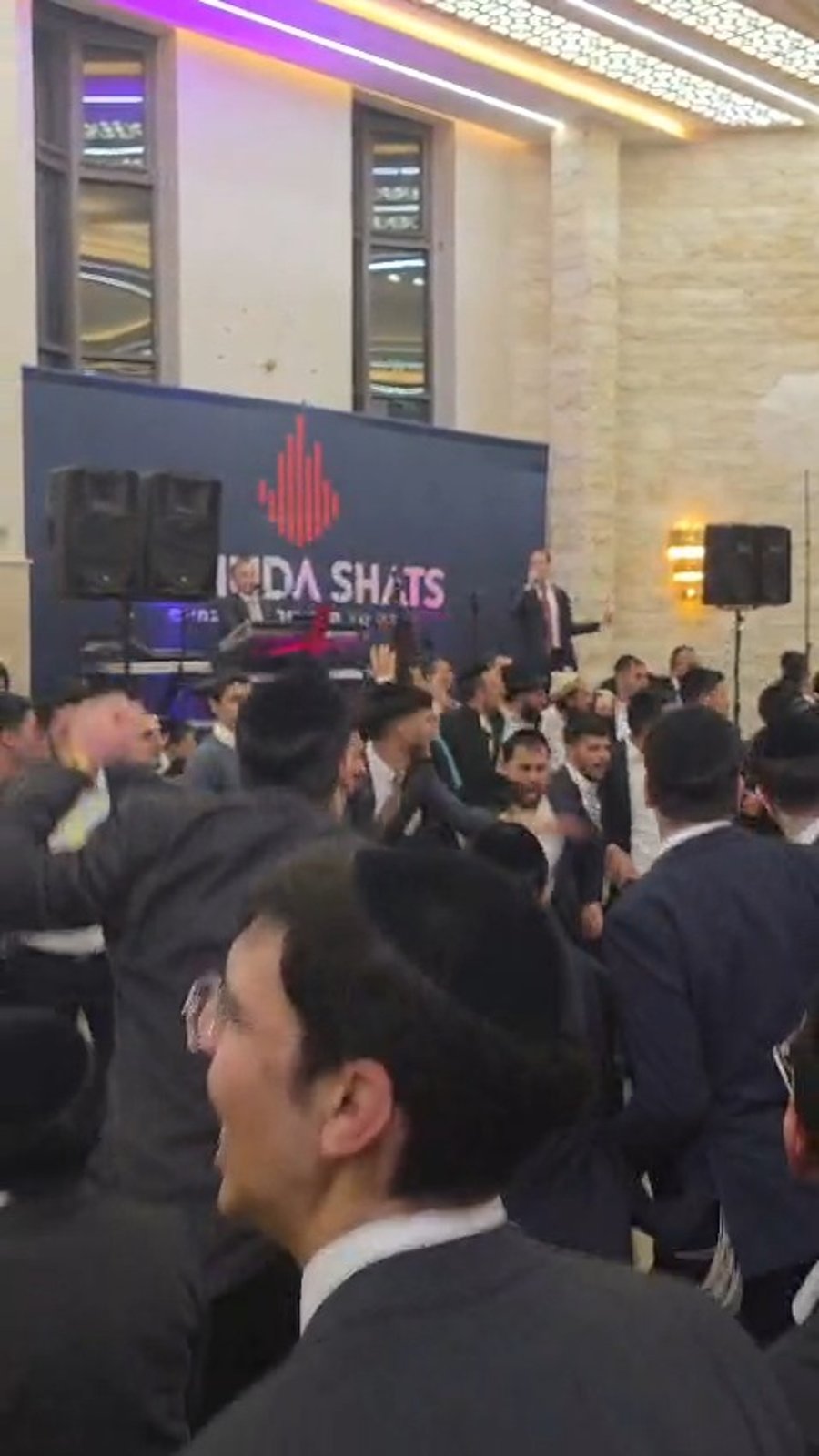המוזיקאים יהודה שץ ויוסי רוטנר מקפיצים בשירה בחתונה שנערכה בבית המדרש בישיבת 'אוהל יוסף', בעקבות המלחמה עם איראן וסגירת האולמות.
