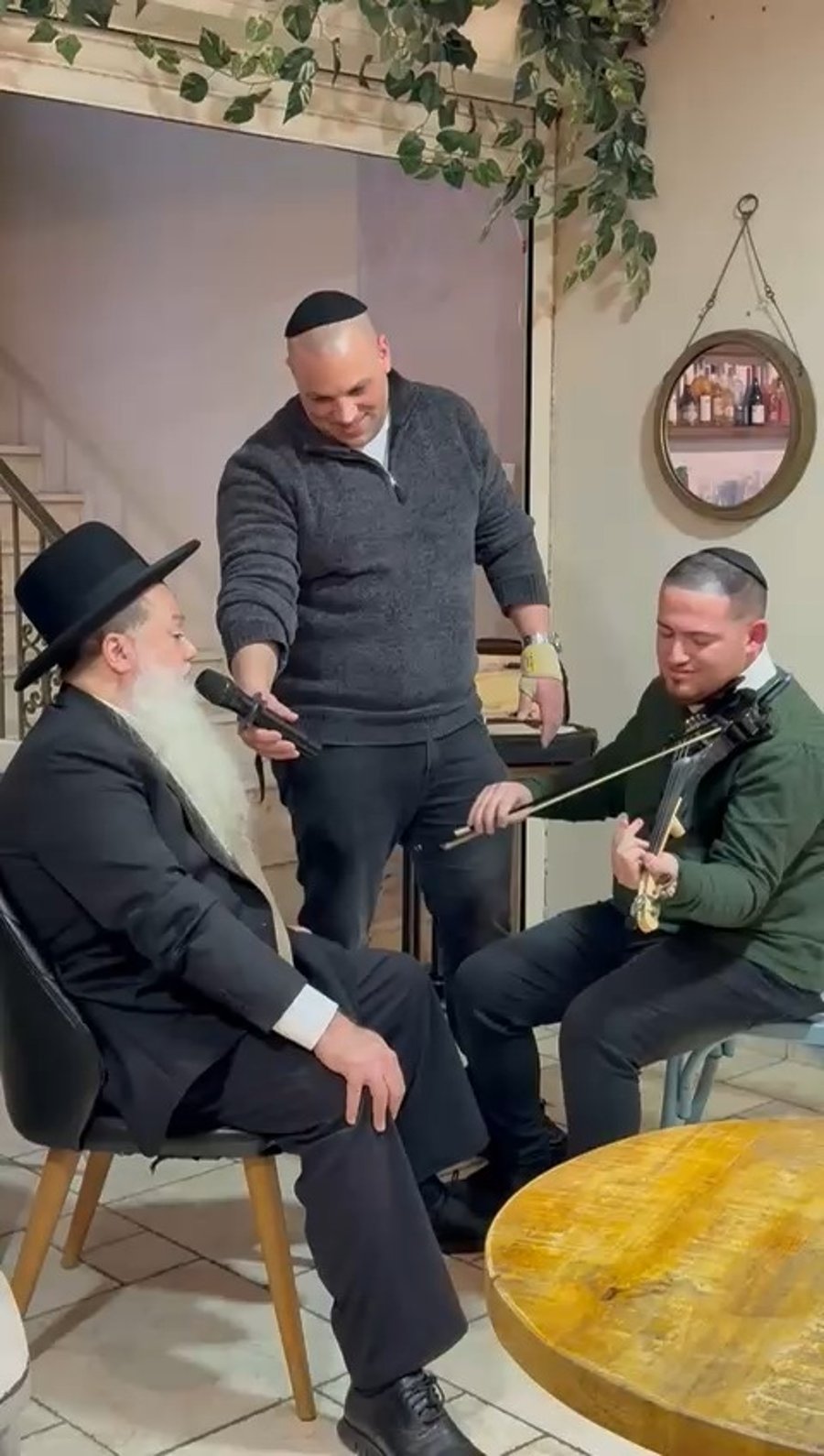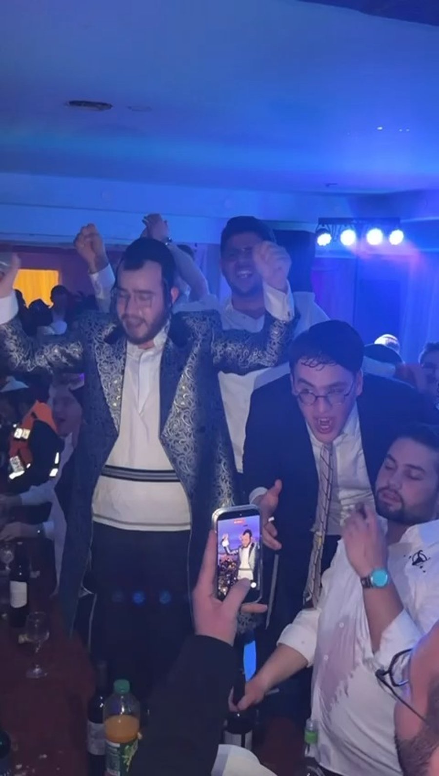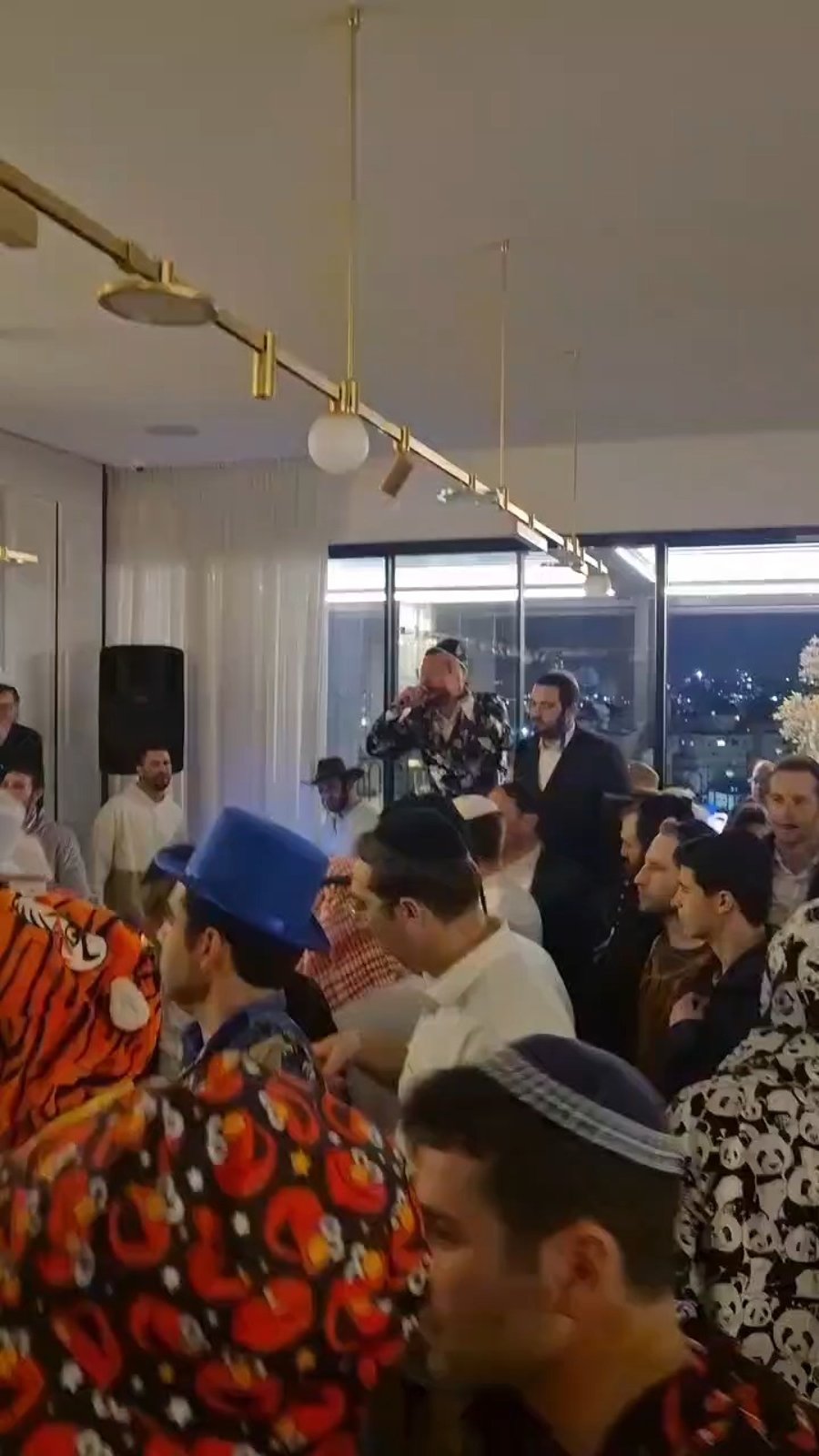 הזמרים מוטי ויזל וארי היל וחברי מקלהת 'נשמה', בשירה מרגשת במשתה הפורים של איש החסד שי גראוכר, אצל הגאון הרב יונתן וילנסקי ראש ישיבת 'דרך חכמה'.