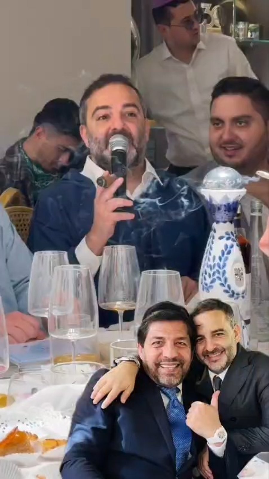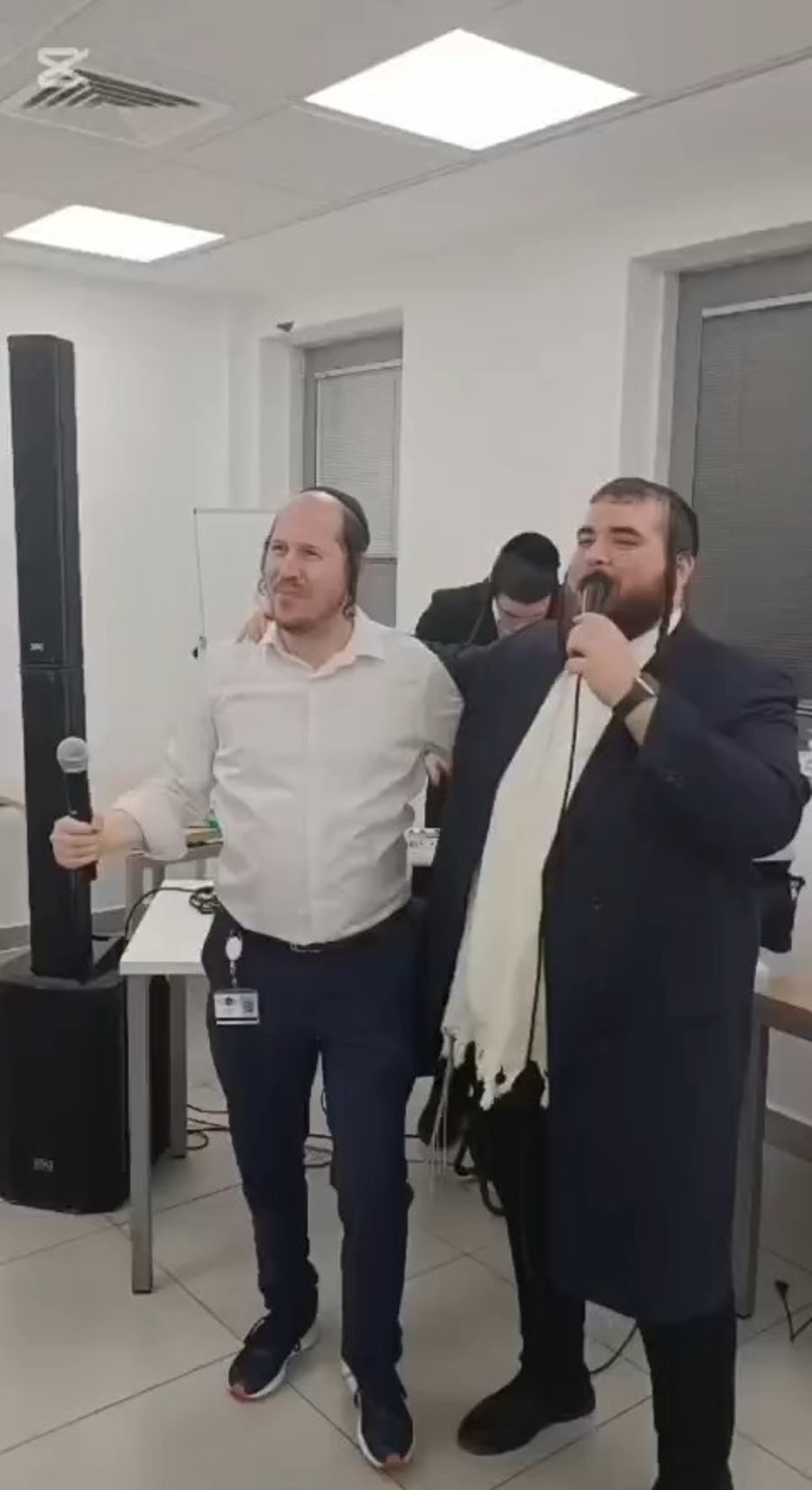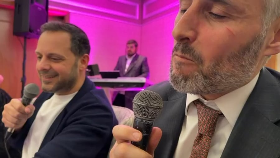 ח"כ חיים ביטון ויזם הנדל"ן אבי סמואלס, מפגינים כישורי שירה בביצוע מיוחד לשיר: "מידת הרחמים", בסעודת פורים של יוסי אליטוב עורך עיתון 'משפחה', במלון 'וולדורף אסטוריה' בירושלים.