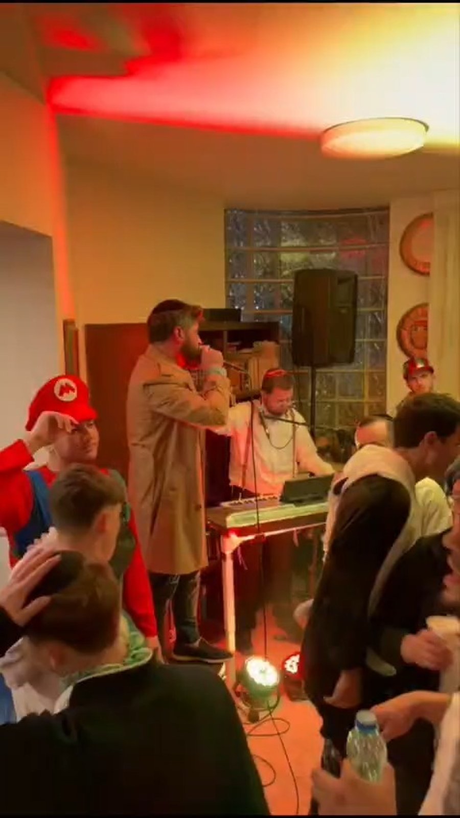 הזמר החב"די ברק גרוסברג בסט ניגונים סוחף במיוחד במסיבת פורים בבית חב"ד בשכונת קטמון בירושלים, על התופים הופקד הפרשן הפוליטי מתי טופכלד מ'ישראל היום'.