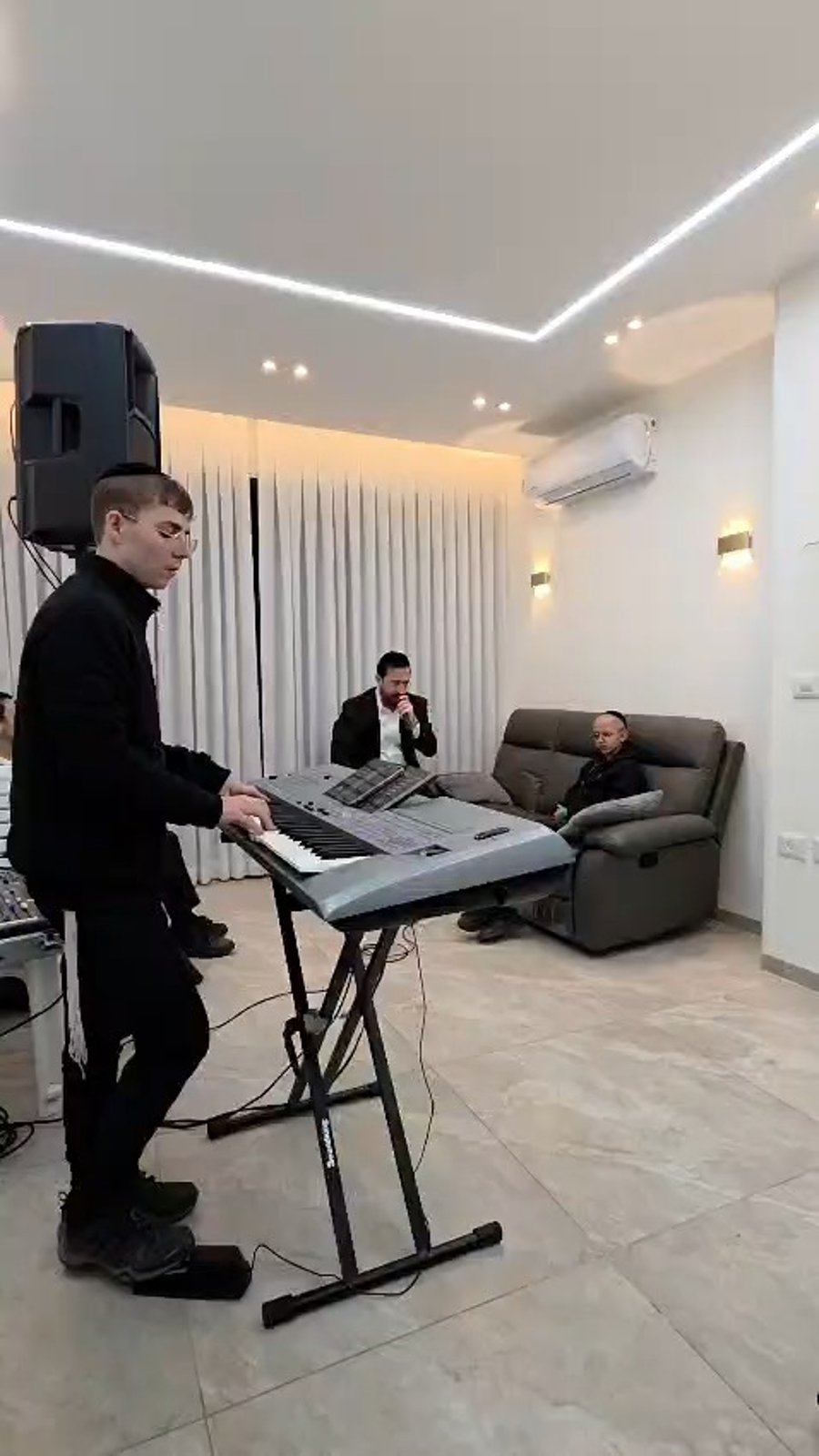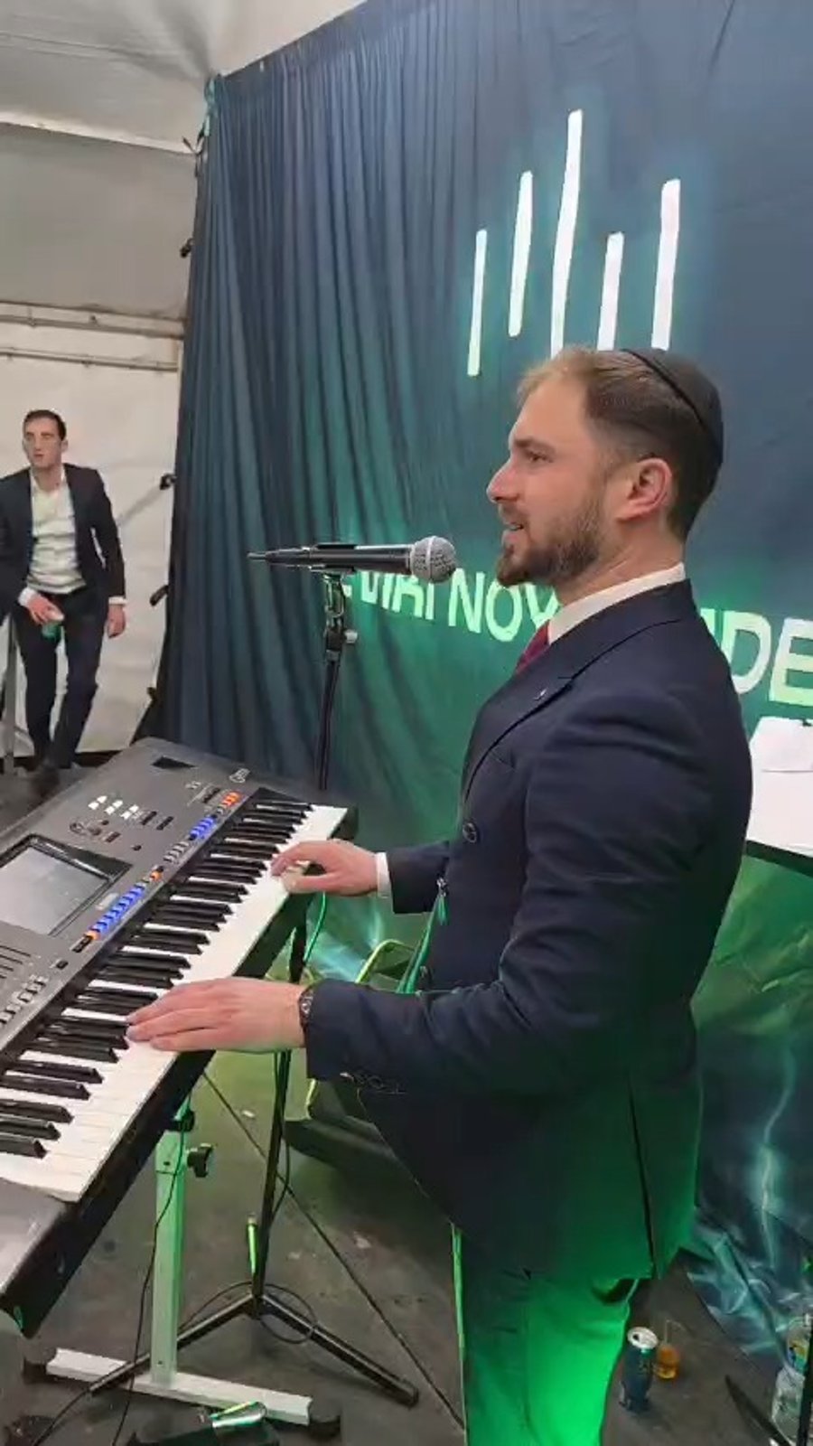 הקלידן צביקי נוילנדר מקפיץ בשירה במסיבת פורים בישיבת 'חברון'.