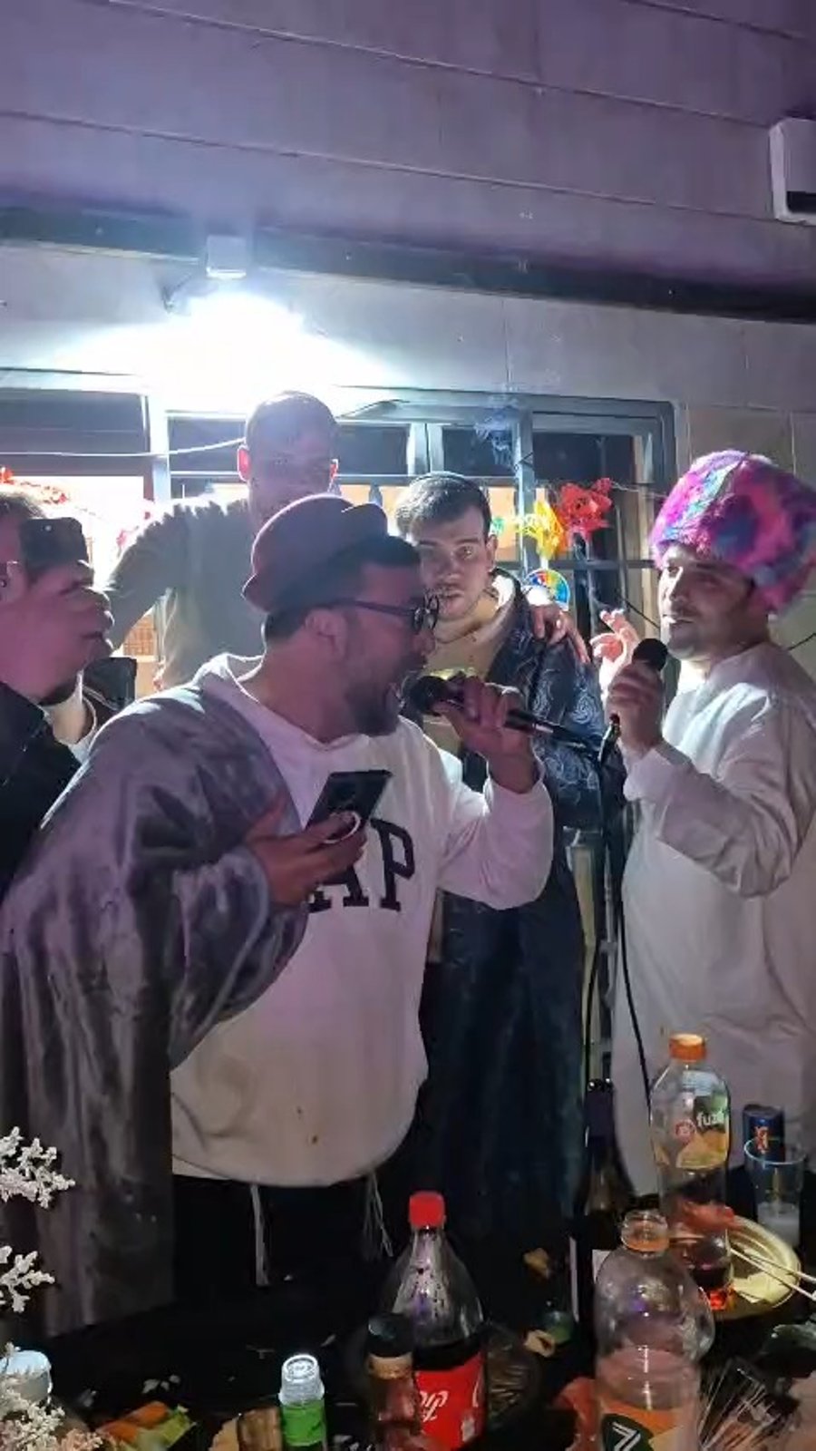 הזמרים יעקב שוואקי ושרולי וינברגר, בשירה מרגשת במשתה פורים בביתו של איש העסקים אברימי גולדשמידט הבעלים של 'אופטיקה 280'.