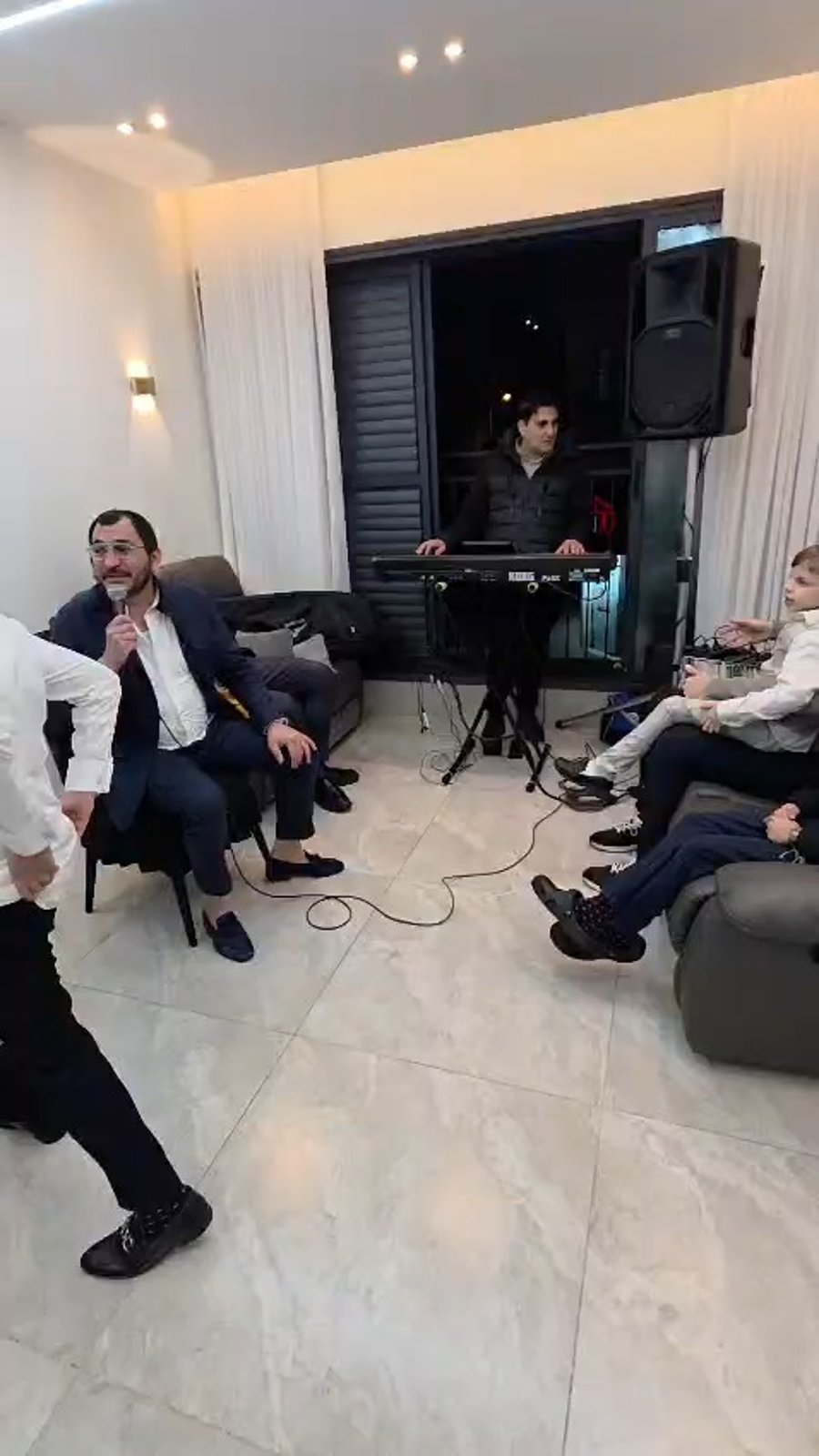 המוזיקאי שמחה אברמצ'יק שהופיע בחתונה מצומצמת בעקבות הנחיות פיקוד העורף והמלחמה עם איראן, משמח את החתן וחבריו במקלט של האולם.
