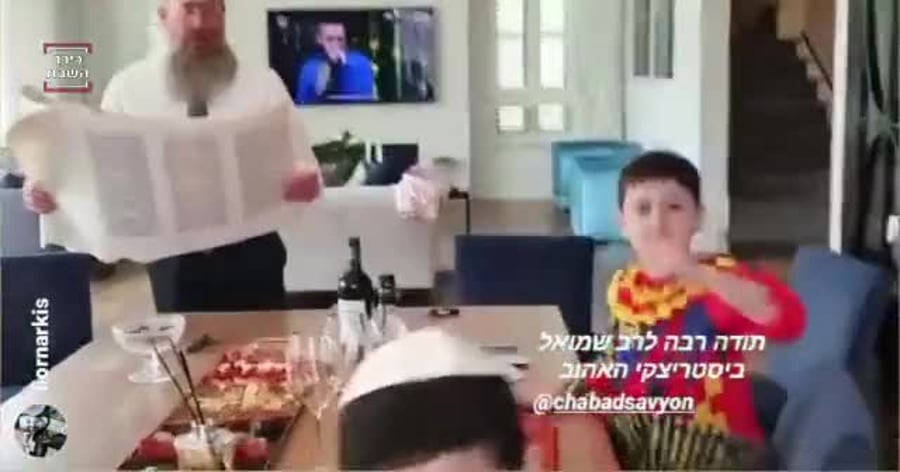 • ולסיום, קצת יהדות: לאחר שיצאו מבידוד עקב חזרם מחו"ל, הזמר הישראלי ליאור נרקיס, רעייתו וילדיהם קיימו את מצוות קריאת המגילה בביתם. בתפקיד הרב: שליח חב"ד ורבה של סביון הרב שמואל ביסטריצקי.