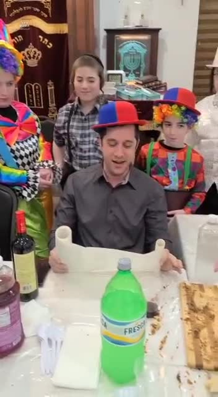 יועץ התקשורת המשמש כבעל קורא בקהילת הר שמואל, נערך עם סוכריות לחלוקה בקריאת מגילת אסתר.