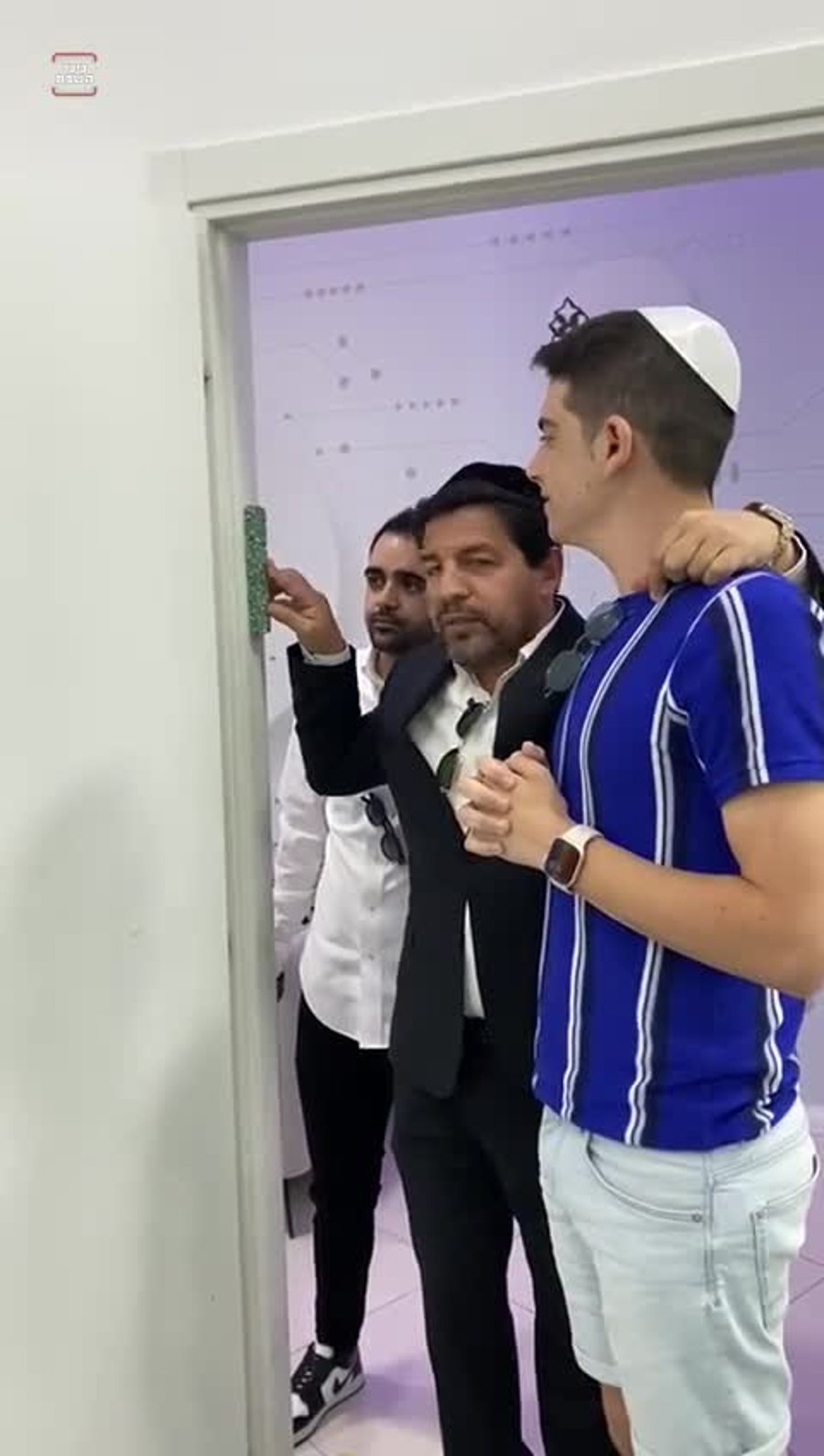 רב הסלבס מרדכי חסידים ואיש 'כיכר השבת' איציק אוחנה בקביעת מזוזה באולפנים החדשים של ערוץ הבידור 'ישראל בידור' יחד עם המייסד דוד סער.