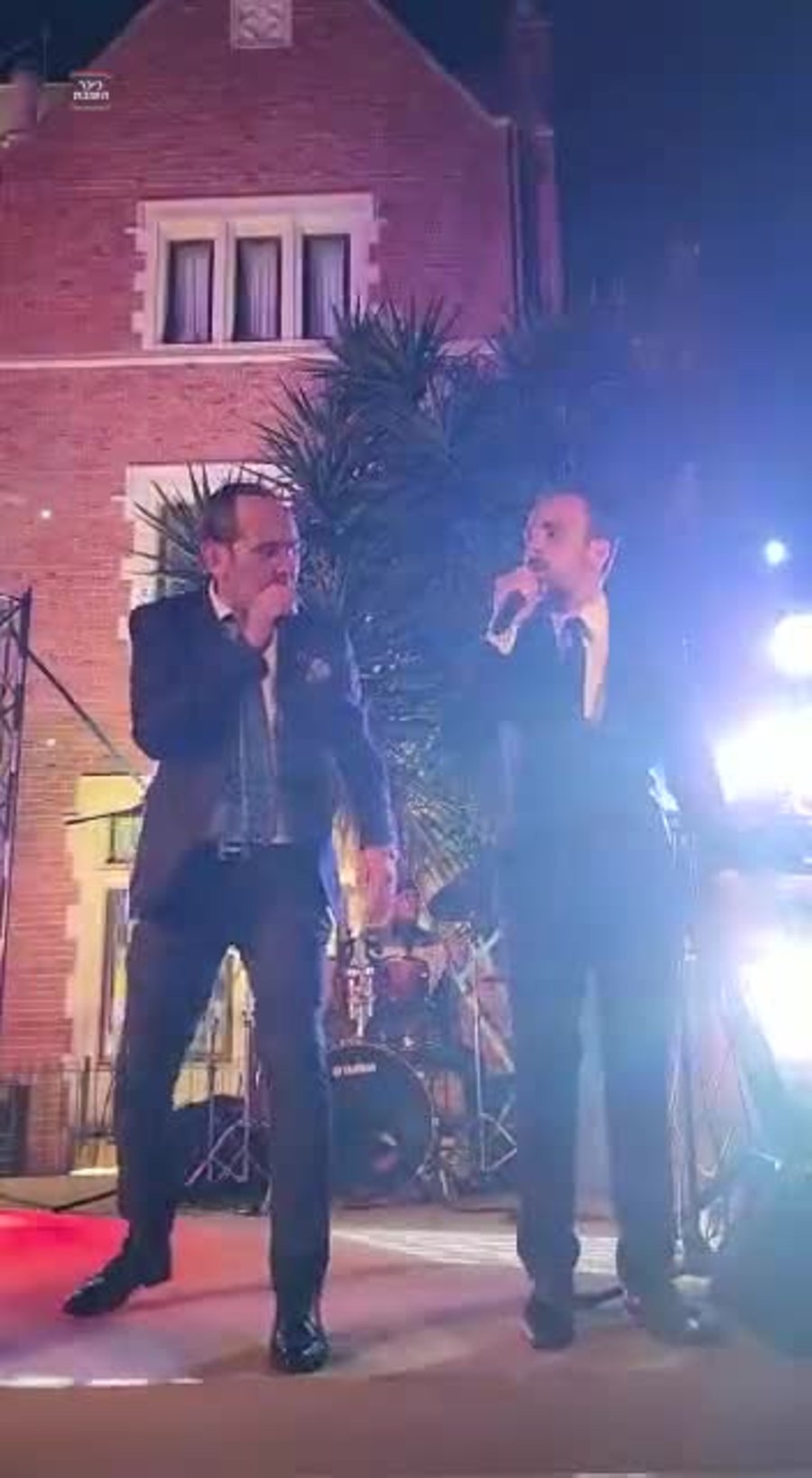 הזמרים נמואל הרוש וישי לפידות בליווי תזמורתו של דני אבידני, מקפיצים בשמחת בר המצווה לבנו של המפיק החב"די שלום טויטו למרגלות בניין 770 בכפר חב"ד.