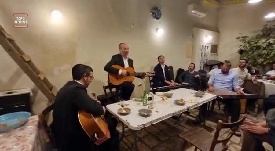 שדרן הרדיו מנחם טוקר, והמוזיקאים קובי ברומר ואהרל'ה נחשוני סועדים אוכל יהודי בבני ברק.