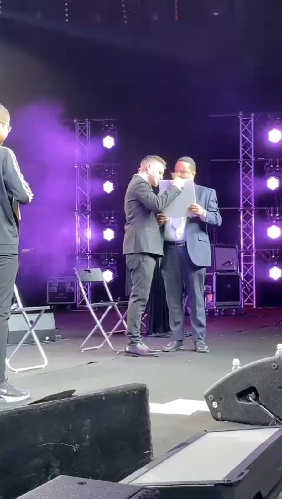 אמן החושים מני הולנדר בקריאת מחשבות לבחורי ישיבה, במהלך המופע הענק של הזמר שולי רנד בבנייני האומה בירושלים.