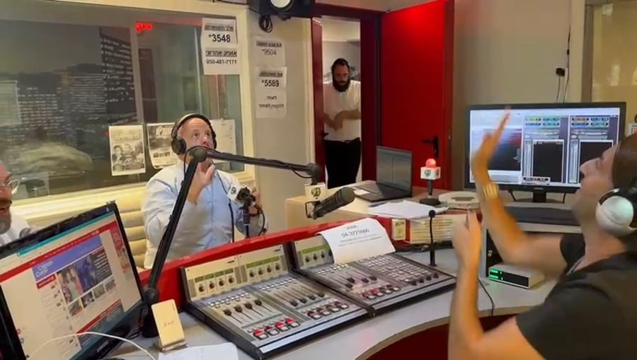 במהלך שידור ברדיו 'לב המדינה' - שדרני הרדיו מנחם טוקר ואליקו נצפו משתעשעים עם המיקרופון. מהצד נראה רבה של שכונת 'צהלה' בתל אביב הרב חיים הורביץ נושא דברי תורה.