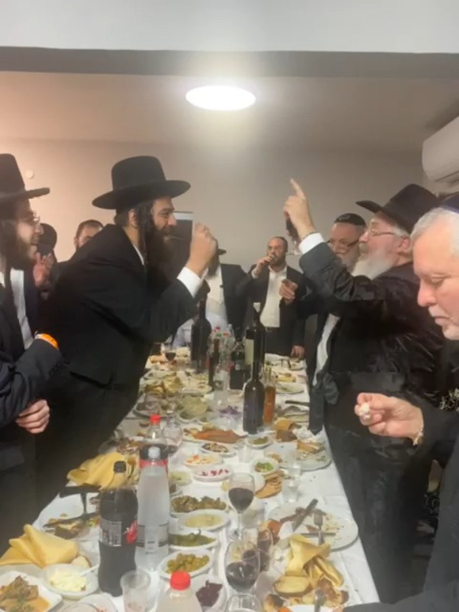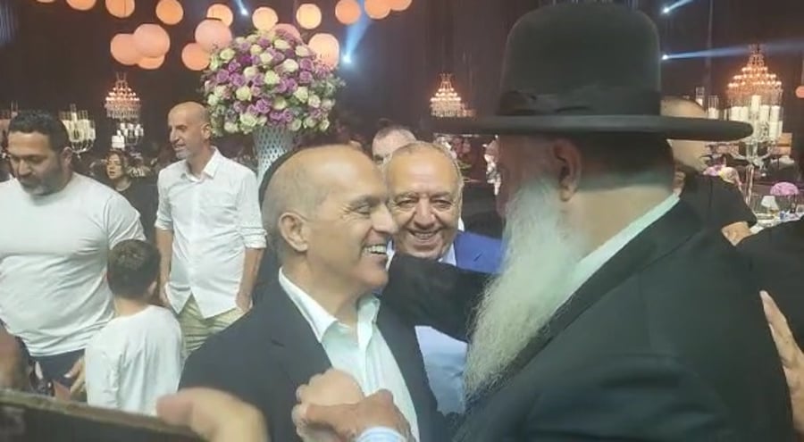 האדמו"ר רבי משה אבוחצירא בהארת פנים ו'לחיים' עם ראש עיריית אלעד ישראל פרוש, בסעודת הילולה שערכו משפחת אבוחצירא לכבוד רשב"י בוילה יוקרתית במירון.