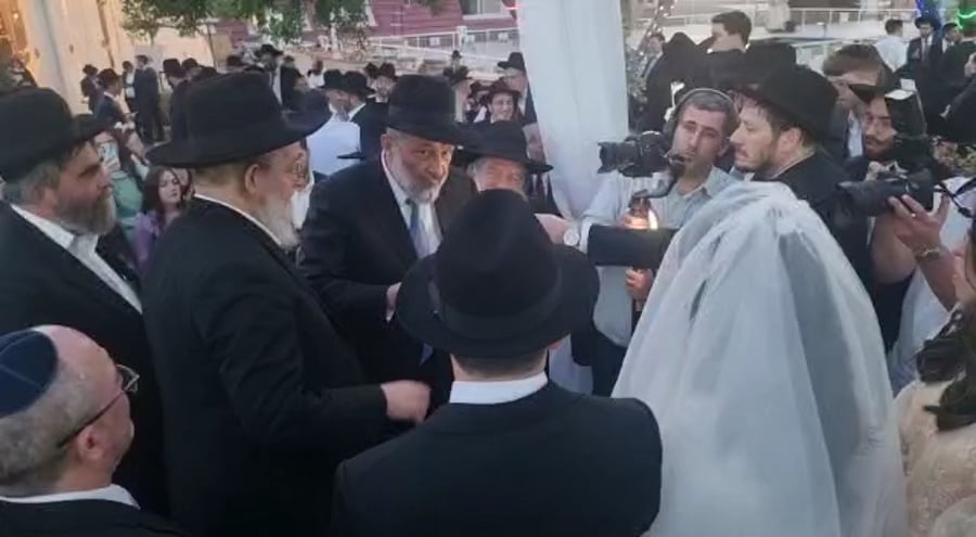 יו"ר ש"ס ח"כ אריה דרעי כובד בברכה בחופת העיתונאי ארי קלמן מ'בחדרי חרדים'.