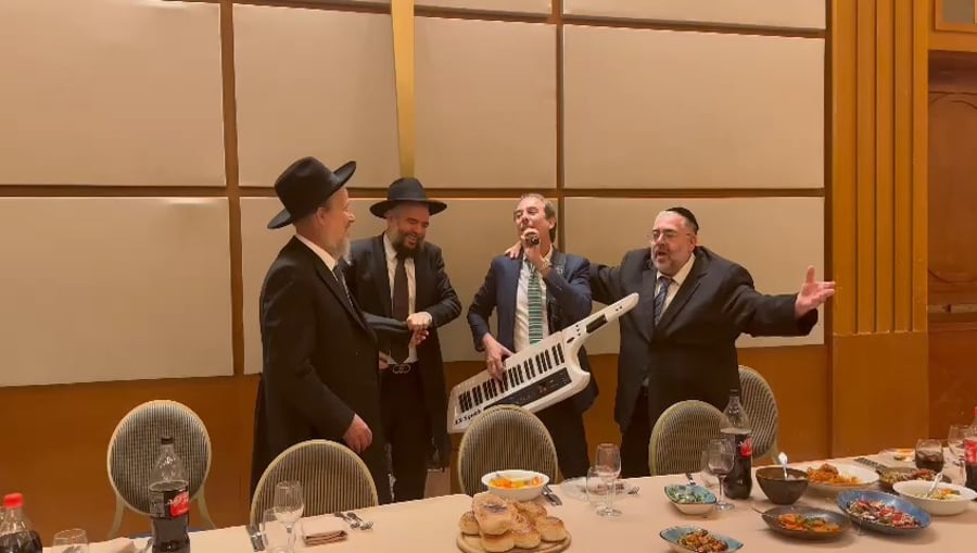 בבית הכנסת במלון 'וולדורף אסטוריה' בירושלים ראינו את הזמר אברהם פריד בשיחה עם האורחים.