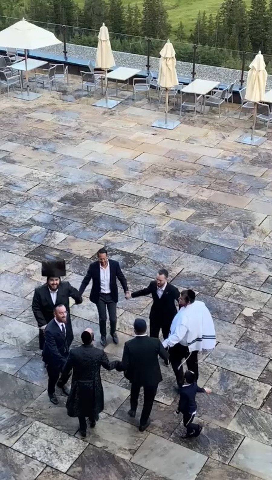 המוזיקאים אריק דביר ונפתלי קמפה, המפיקים שלום וגשל וחיים אילוז, ויזמי הנדל"ן יוסי בייניש ויחזקאל הלפרין בקבלת שבת במסגרת חופשה בעיירה ארוזה שבשווייץ.