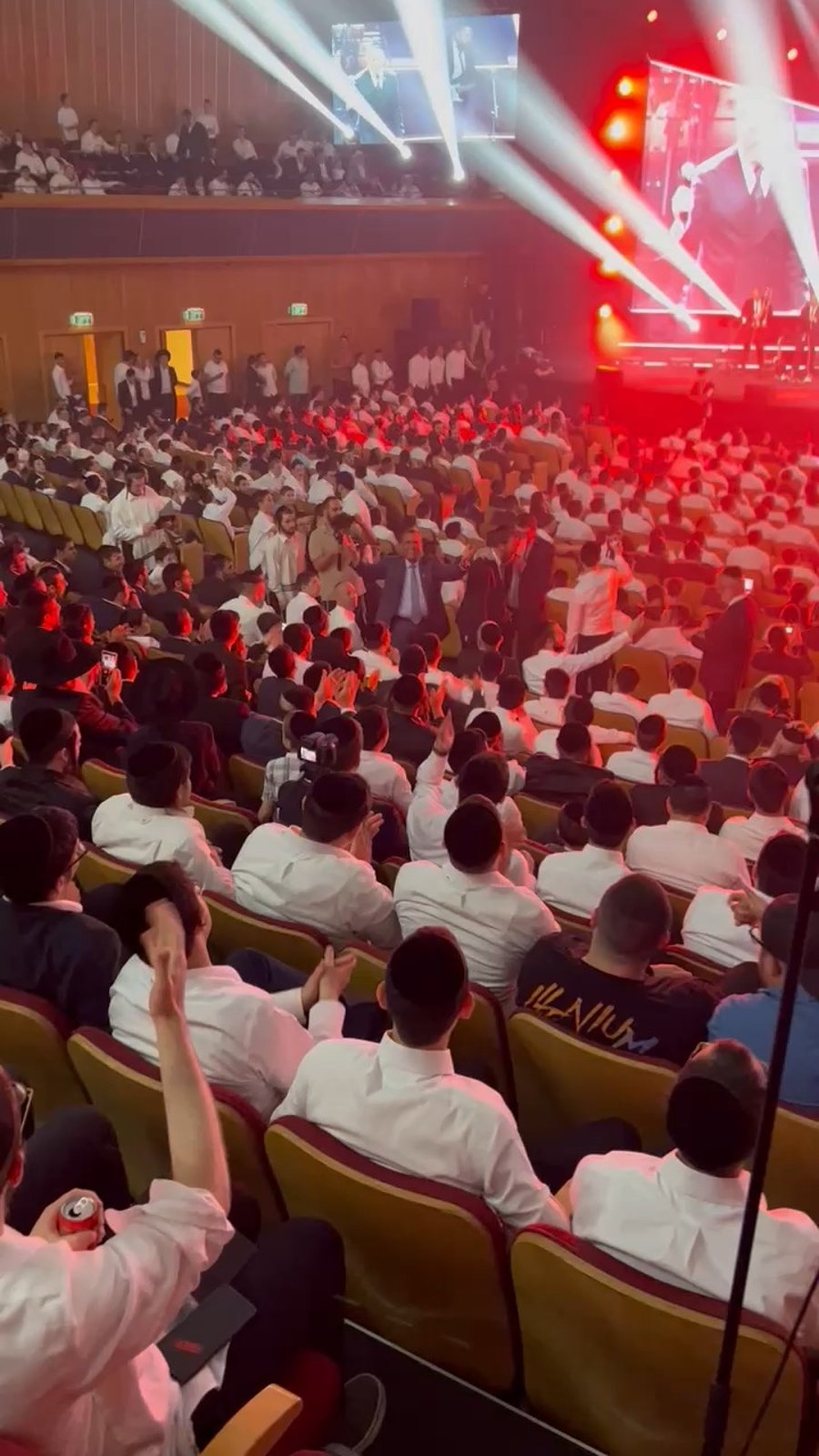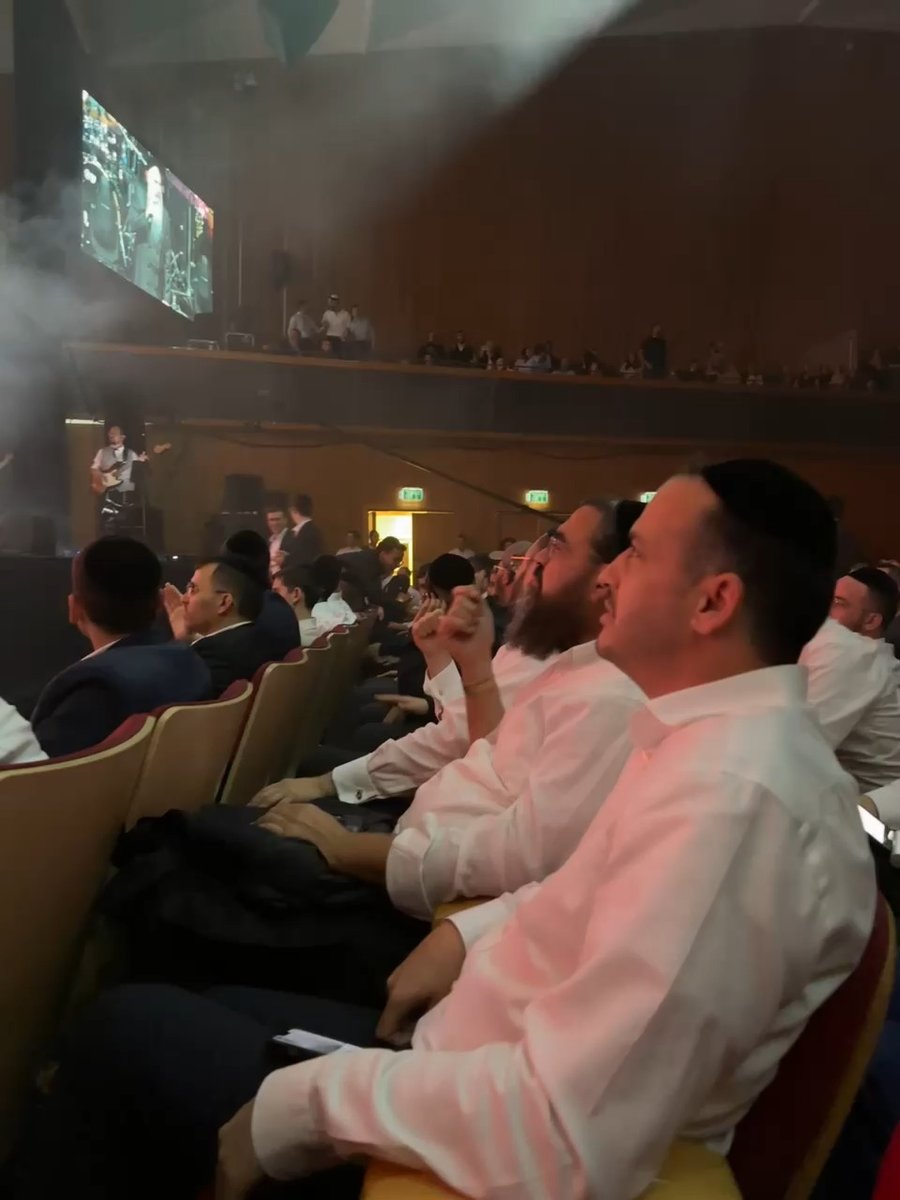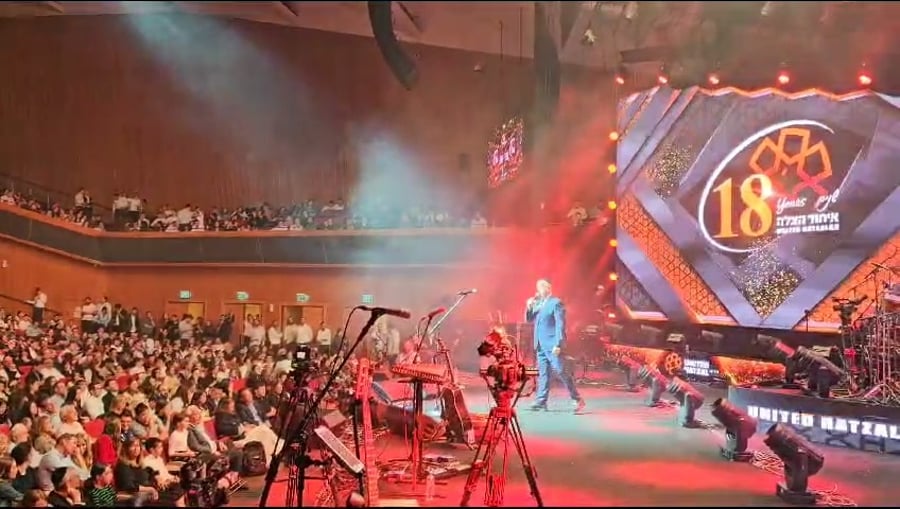 ראש העיר ירושלים משה ליאון משלהב אלפי בחורי ישיבות במופע של הזמר יעקב שוואקי ב'בנייני האומה', מהצד נראה מנכ"ל רדיו 'קול חי' אבי רוזן ופנחס ארליך מנהל האגף לתרבות תורנית בעיריית ירושלים.