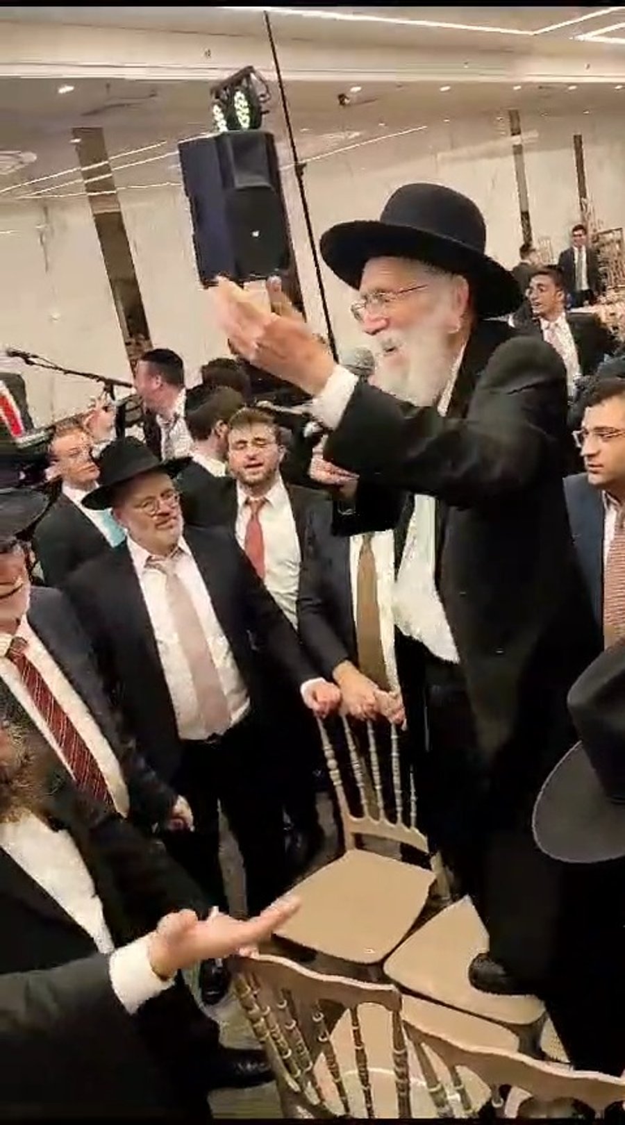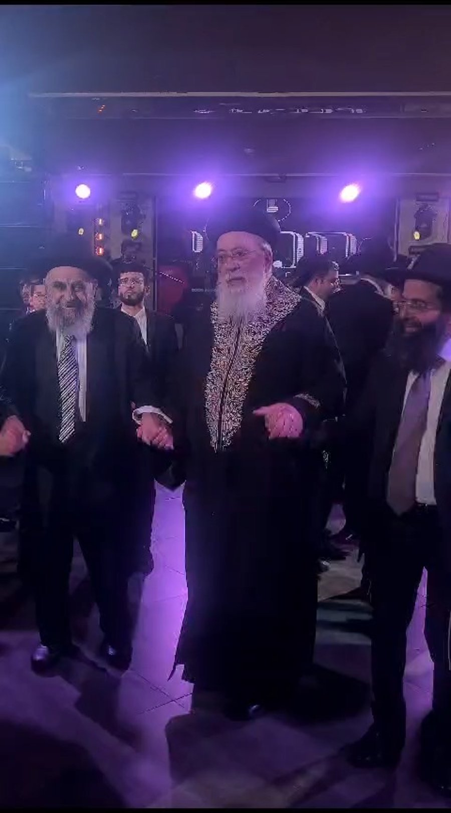 הגאון הצדיק רבי שמעון גלאי בריקוד של שמחה בחתונה של בני זוג מהדרום שנערכה בדקה ה-90 במרכז הארץ בעקבות המלחמה.