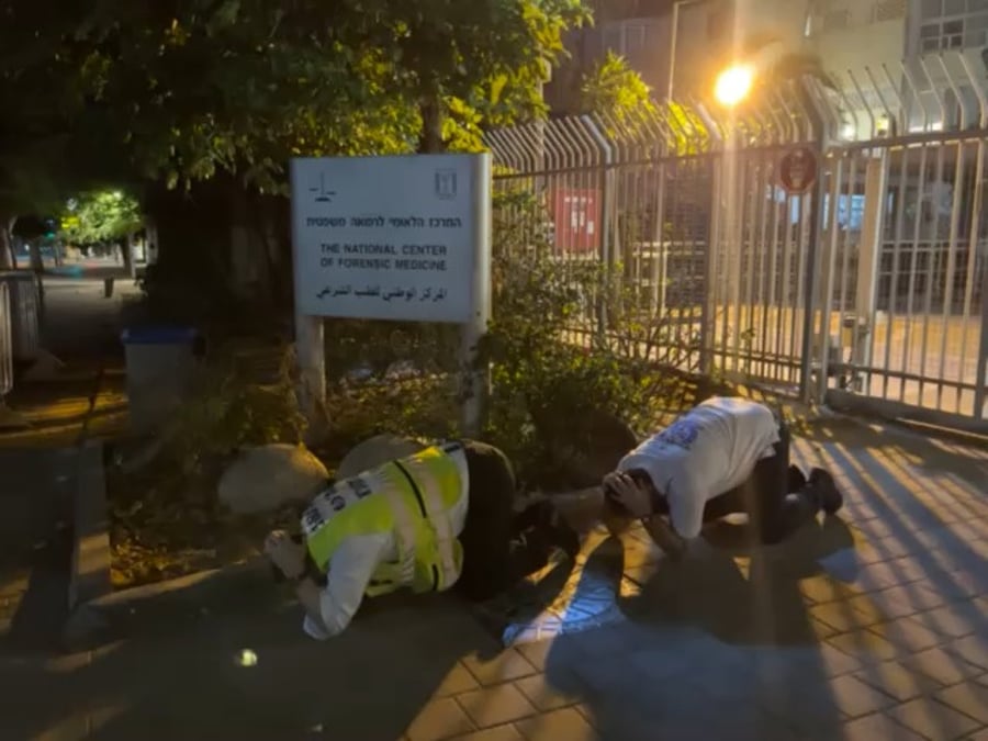 אזעקה מוקלטת! מחוץ למכון לרפואה משפטית אבו כביר, ראינו את מנכ"ל זק״א ת״א צבי חסיד והקמב״צ יחיאל גולדמן תופסים מחסה בעת אזעקה וירי טילים, בעת שהביאו גופות לזיהוי מהלחימה בדרום.