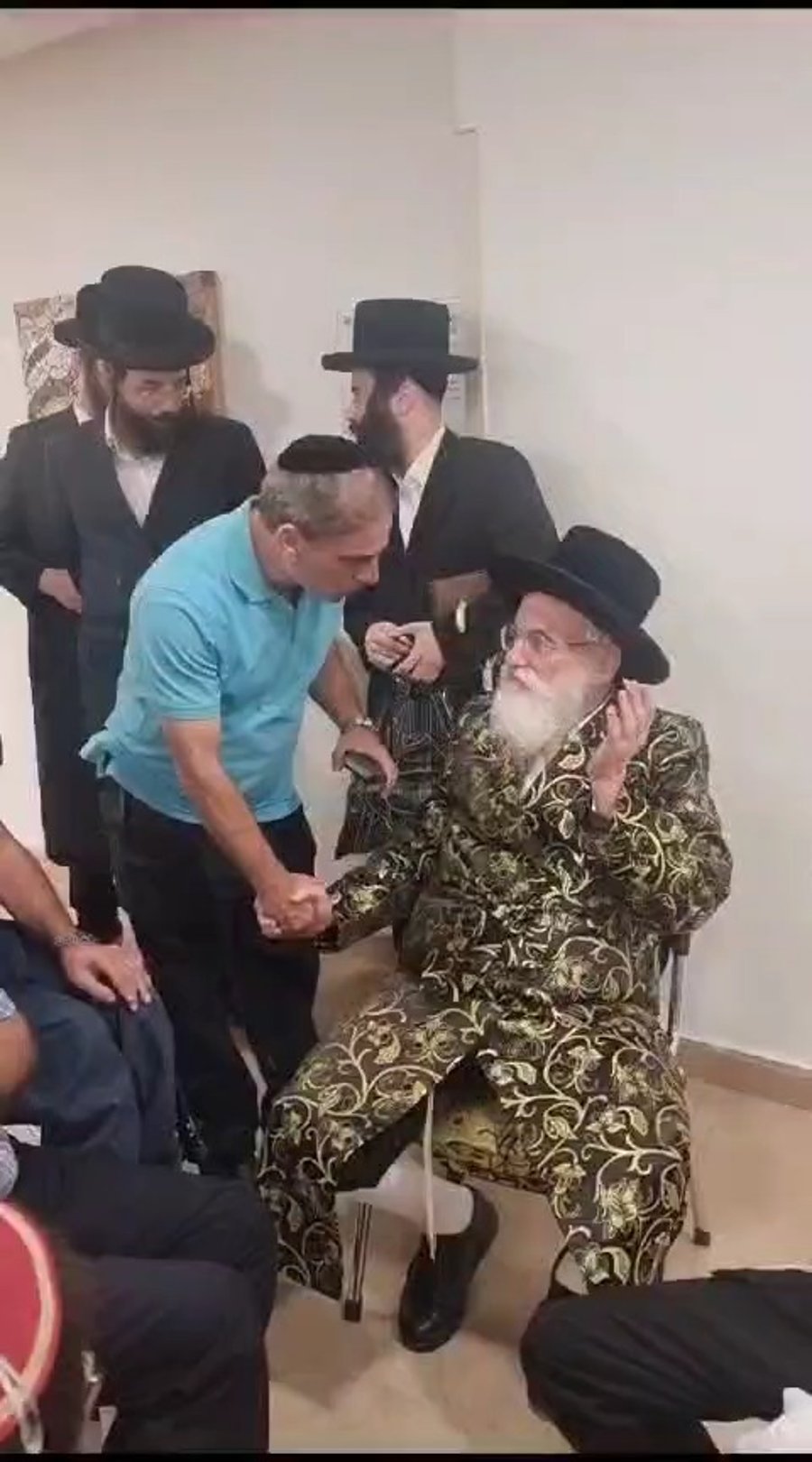 איש החסד שוקי בריף מ'תל השומר' מתברך במאור פנים מהאדמו"ר מויז'ניץ שהגיע לבקר את פצועי המלחמה המאושפזים בבית החולים.