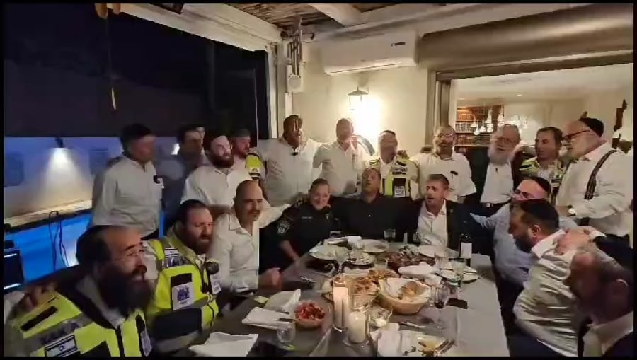 השר לביטחון לאומי איתמר בן גביר מ'עוצמה יהודית', שר הפנים משה ארבל, יו"ר ועדת החינוך ח"כ יוסי טייב מש"ס ומפכ"ל המשטרה קובי שבתאי - בשירי רגש בערב תמיכה למתנדבי זק"א שטיפלו במסירות בגופות הנרצחים בטבח בעוטף עזה, באחוזה של הנגיד אייל משיח.