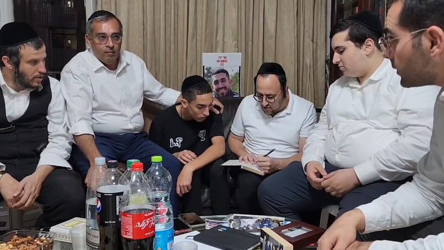 הזמר ליפא שמלצר שהגיע לביקור בזק בארץ הקודש לשמח את חיילי צה"ל ומשפחות החטופים, מחזק את בני משפחתו של אורי דנינו שנחטף לעזה, כשהוא מלווה בעסקן הרפואי מוטי פריד יו"ר 'סעד ומרפא'.