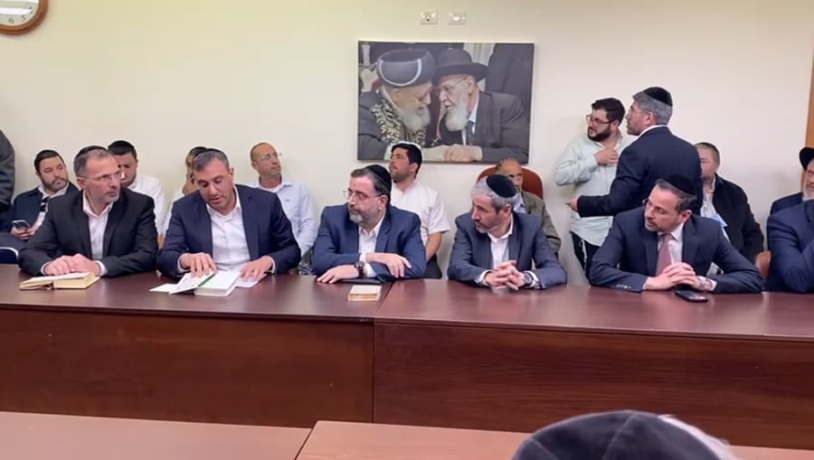 ראש עיריית ירושלים משה ליאון, חבר מועצת העיר ירושלים יוחנן ויצמן מ'אגודת ישראל', יהודה מורגנשטרן מנכ"ל משרד הבינוי והשיכון ומוטי בבצ'יק האיש החזק בחסידות גור, בסוד שיח סוער באירוע פרטי.