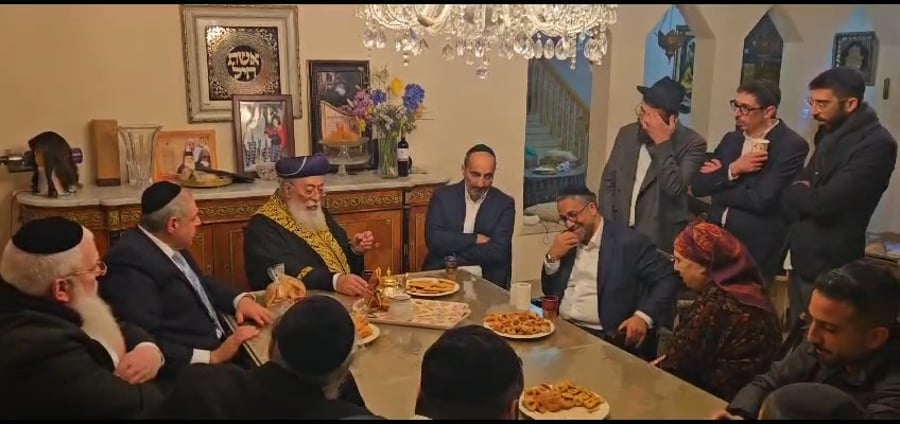 איש העסקים בני פרץ מתברך במאור פנים מהרבנית סימי אבוחצירא אשתו של 'הבאבא סאלי', מהצד נראה הנכד המסור חיים מורסיאנו.