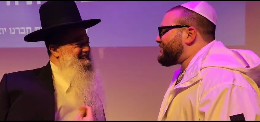 מזכה הרבים הגאון הרב יגאל כהן ראש מוסדות 'יביע אומר', מברך במאור פנים את הזמר אליאב זוהר במהלך אירוע חיזוק בעיר פתח תקווה.