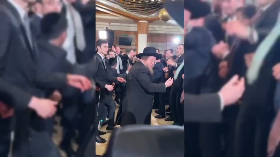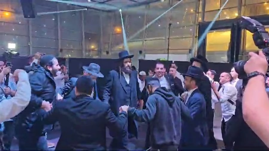 הגאון רבי שלום בער סורוצקין ראש מוסדות 'עטרת שלמה', מתקבל בשירה וריקודים בחתונת בתו של העסקן האלעדי משה שטיין, באולמי 'כתר הרימון' בבני ברק.