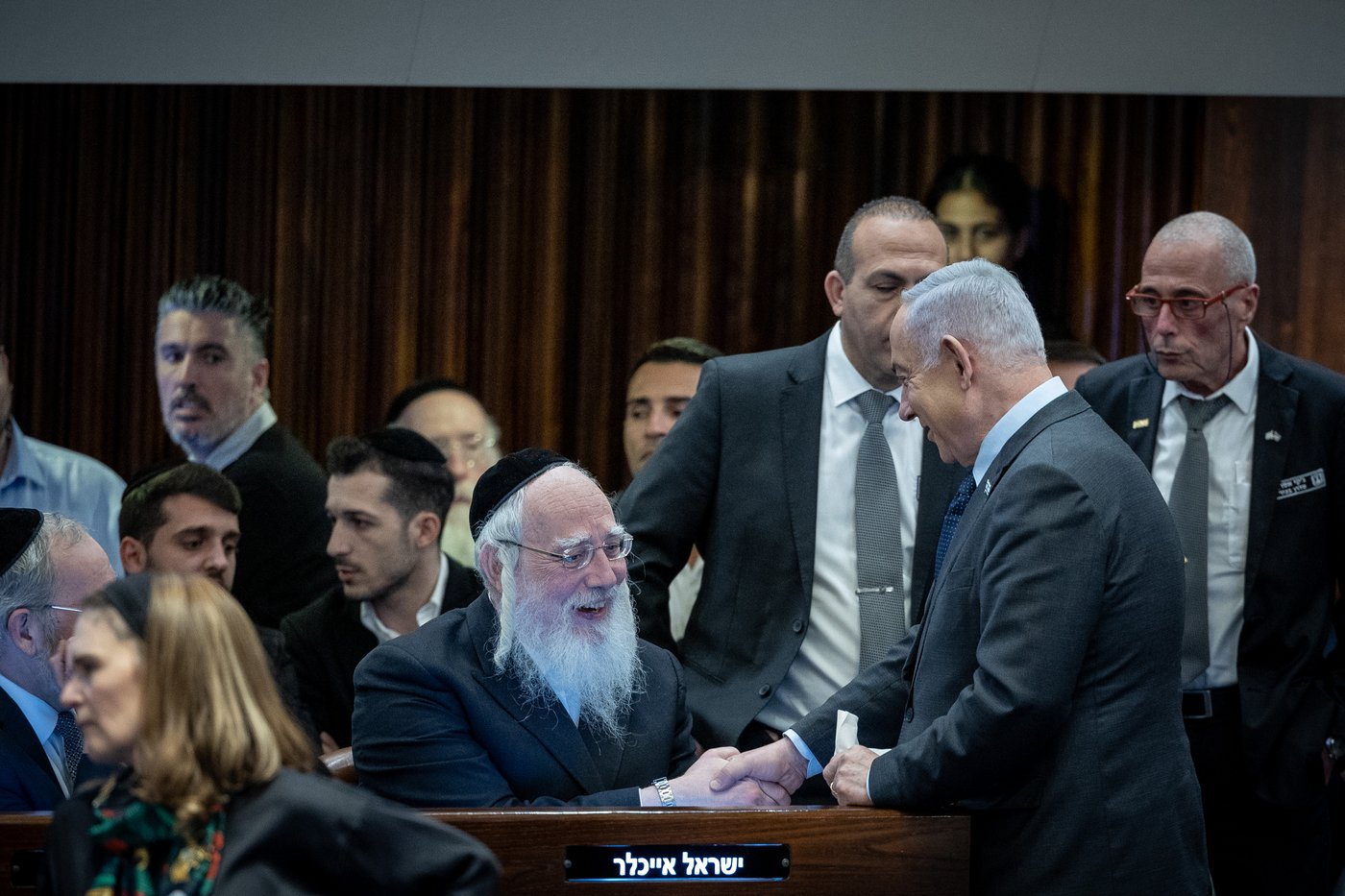 בהמשך ראינו לחיצת יד מחויכת ומפתיעה בין ראש הממשלה בנימין נתניהו לבין ח"כ ישראל אייכלר מ'אגודת ישראל'.