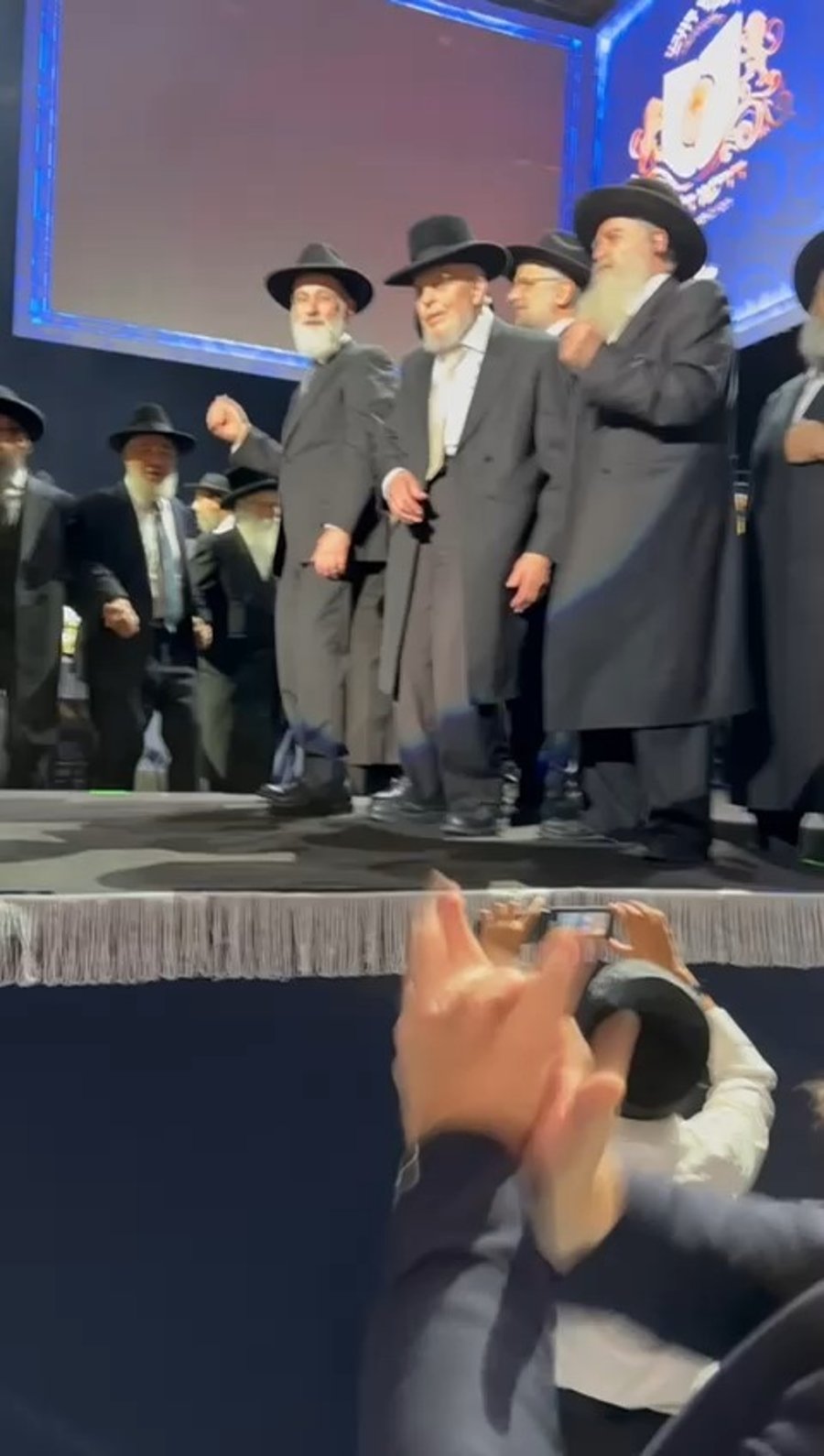 האדמו"ר רבי רפאל אבוחצירא, הגאון רבי יצחק אזרחי מראשי ישיבת 'מיר' בירושלים והרב דוד הופשטטר נשיא ארגון 'דרשו' - בריקוד משותף באירוע תורני של הארגון בארגנטינה.