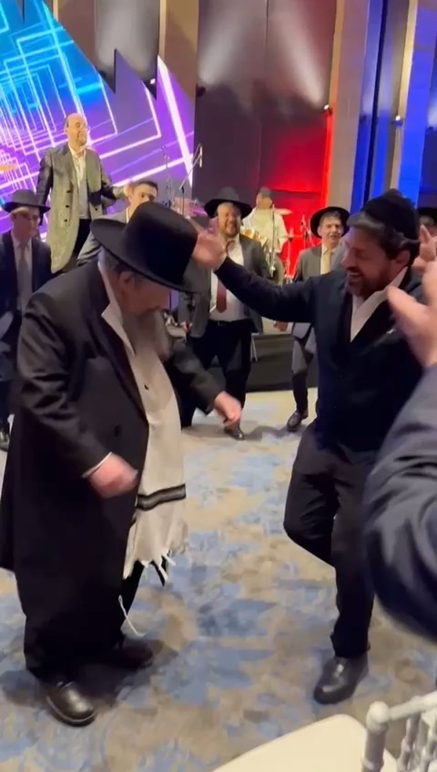 הזמר מרדכי בן דוד ומקורבו איש העסקים זאבי פריד מארצות הברית, בריקוד סוער בחתונת נכדו של בן דוד, בן לבנו הזמר יידל ורדיגר.