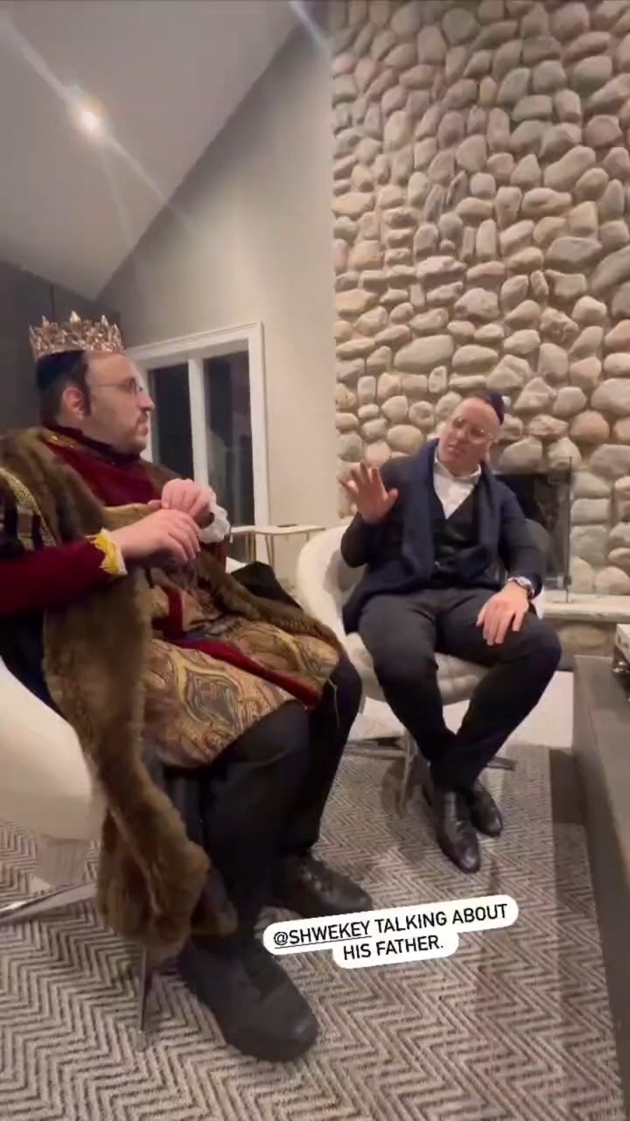 המפיק עוזר דרוק ובנו דוד, מתברכים בטיש פורים אצל האדמו"ר מפרמישלאן.