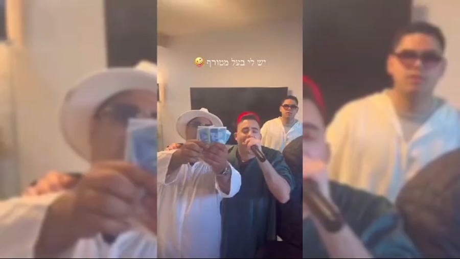סגולה לשפע גדול: איש העסקים אלי לביא מפזר שטרות של כסף על הזמר אופיר סלומון, במהלך מופע במשתה הפורים אצל איש העסקים רפי בוזגלו.