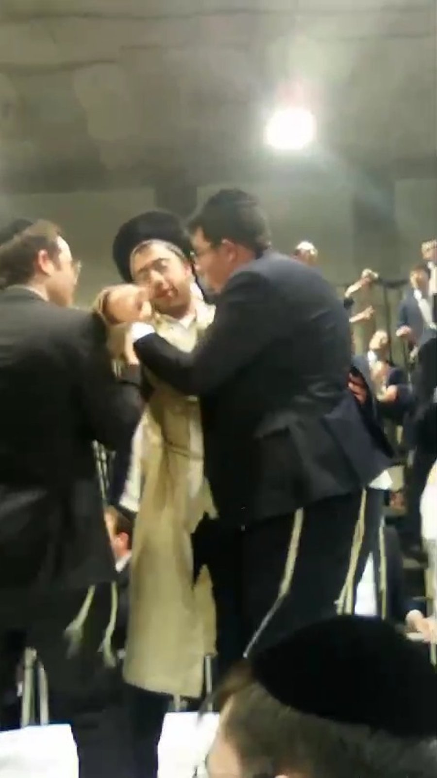 הגאון רבי שלום בער סורוצקין ראש מוסדות 'עטרת שלמה', בריקוד סוער במשתה הפורים אצל יד ימינו הרב אלחנן שרבאני.