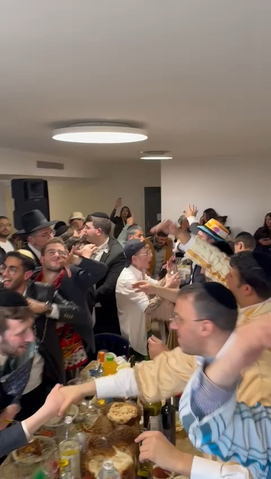 בהמשך ראינו את הבחור החשוב שלמה יעקבזון מבכירי הישיבה, כשהוא מפזז בריקוד על השולחן בתחפושת של חסיד.