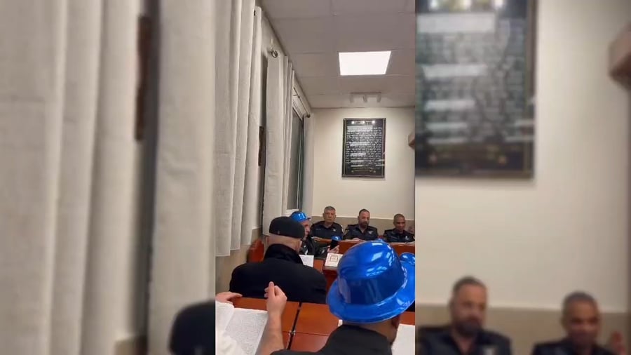 ניצב פרץ עמר מפקד מחוז ת"א, נצ"מ דניאל חדד מפקד מרחב דן וסנ"צ רותם וסקר מפקד תחנת ב"ב ור"ג - בקריאת מגילת אסתר בבית הכנסת של יגאל גואטה בבני ברק.