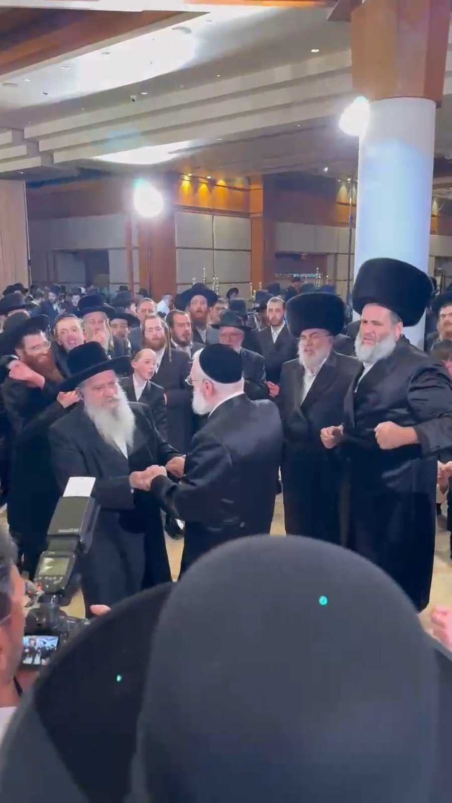 בהמשך ראינו את הראשון לציון הגאון רבי יצחק יוסף והגאון רבי יצחק אזרחי מראשי ישיבת 'מיר', מברכים אחד את השני.